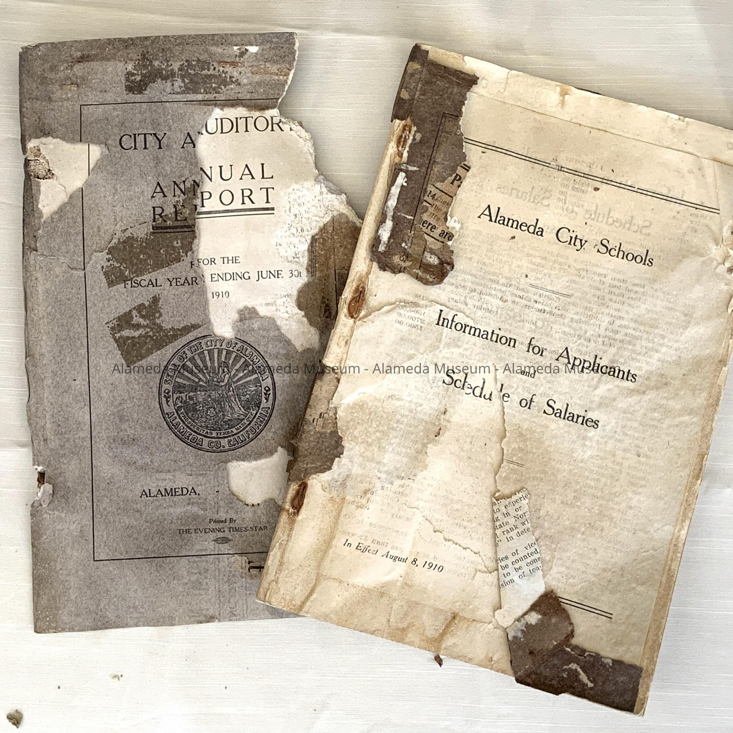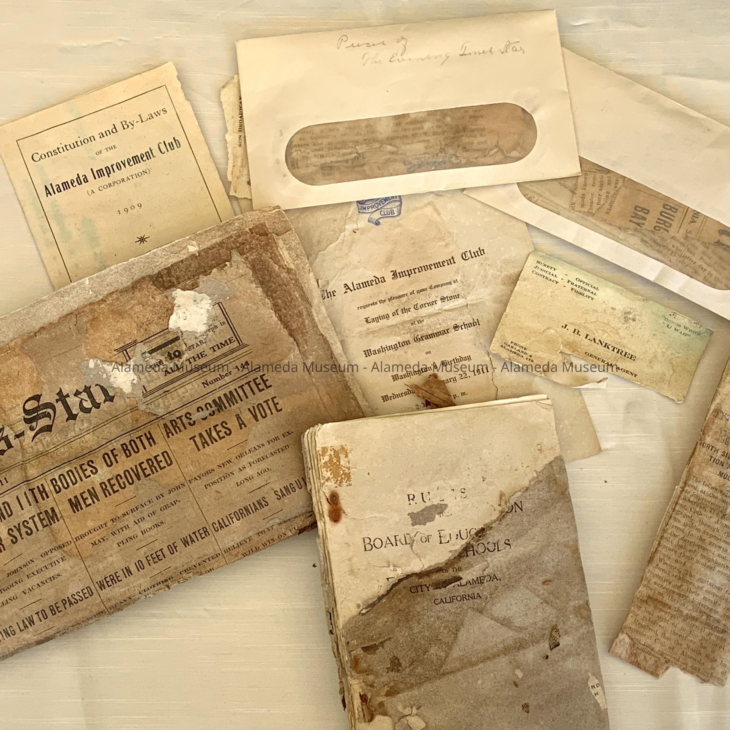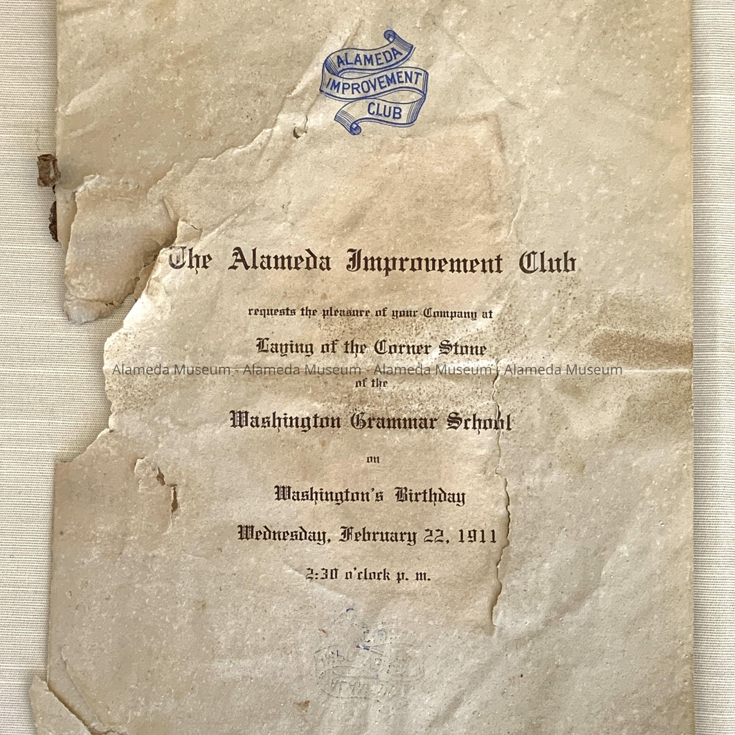 History of Object: contents of the cornerstone box of the Washington School, placed there February 22, 1911 - building had begun in 1909. This school was replaced in 1957 by a new school, renamed Maya Lin in 2012. Opening of the box was done by the Alameda Historical Society, in the gardens of Justice and Mrs. Homer R. Spence of 1200 St. Charles Street, exact date unknown, but likely 1956.