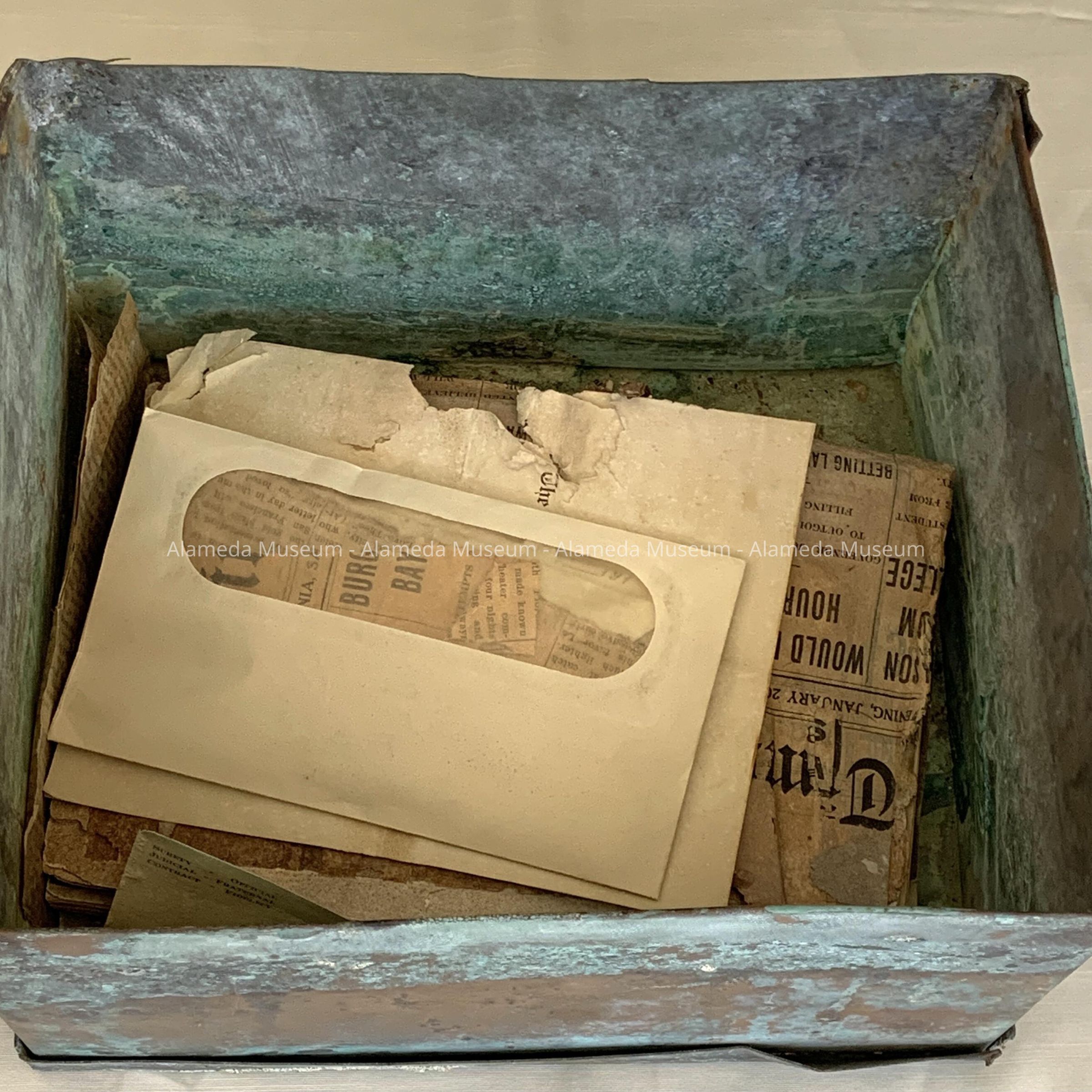 Description: weathered copper box, with lid, with remnants of plaster, and paper contents, most either in fragments and placed in envelopes or fused together through water damage and stained with black mold.
