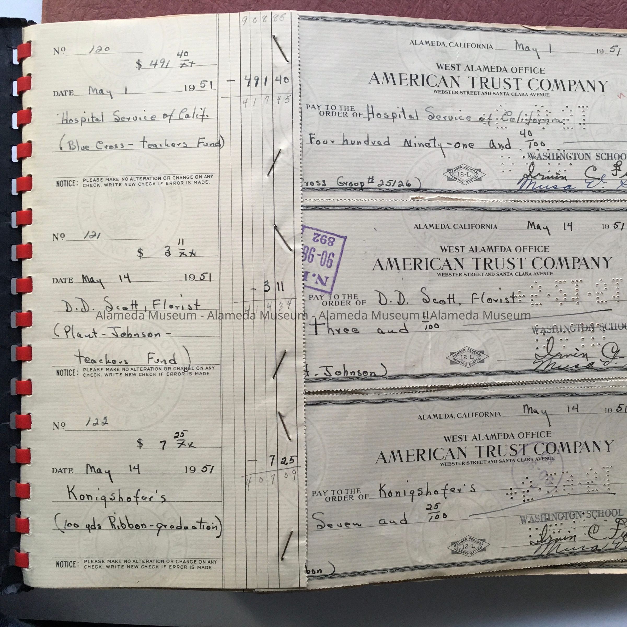 Inside are slips from a checkbook, with the cancelled checks stapled on. Checks were from American Trust Company, and have all been stamped 'Washington School Fund' above the comment line. Dates A: September 1949 to April 1951, B: May 1951 to December 1953.