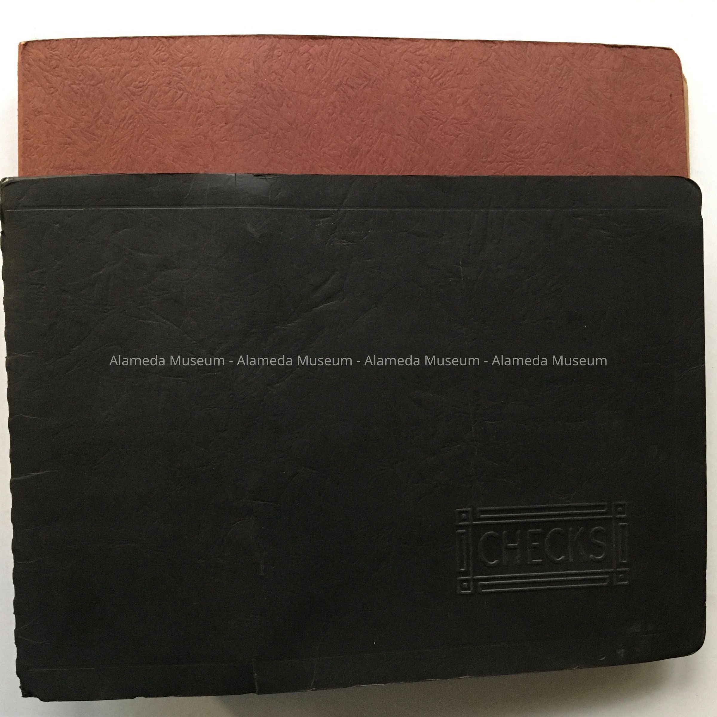 Description: Two oblong binders, A: three-ring binder with brown leather-look card stock cover; B: black, spiral bound with red plastic circular spine, and cover of black leather-look card stock, with embossed the word 'Checks'.
