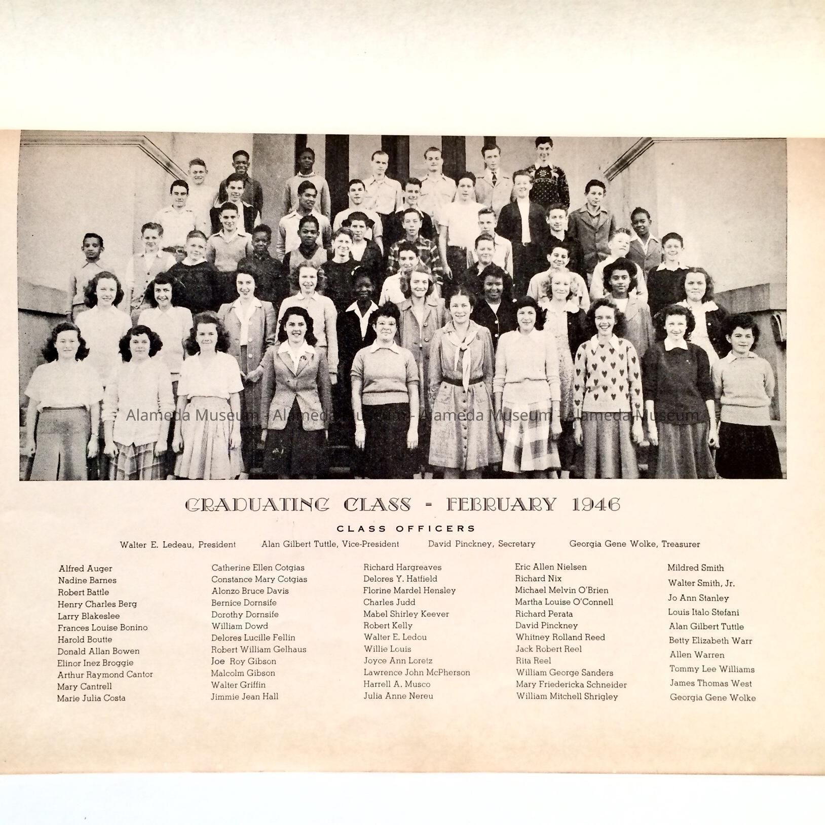 HISTORY OF OBJECT: A PUBLICATION FROM FEBRUARY 1946 OF THE "GREEN AND WHITE" PRODUCED BY STUDENTS OF WASHINGTON SCHOOL. INCLUDED INSIDE IS A PHOTOLITHOGRAPHIC ILLUSTRATION OF THE GRADUATING CLASS OF FEBRUARY 1946.