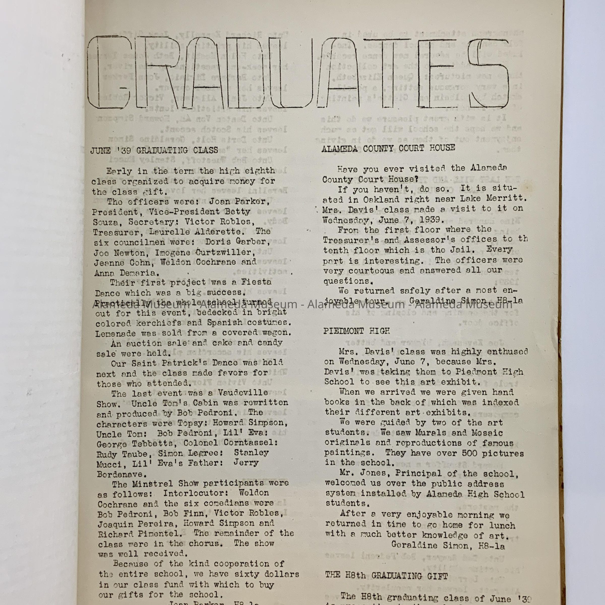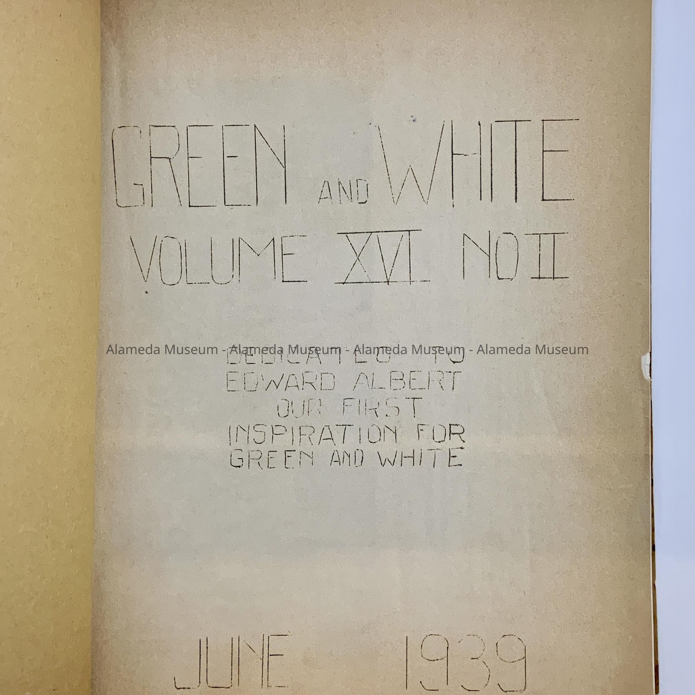 History: Washington School publication entitled, “Green and White” for June 1939. Contents include a list of graduates and graduating class photographs, poems and articles written by members of the student body.