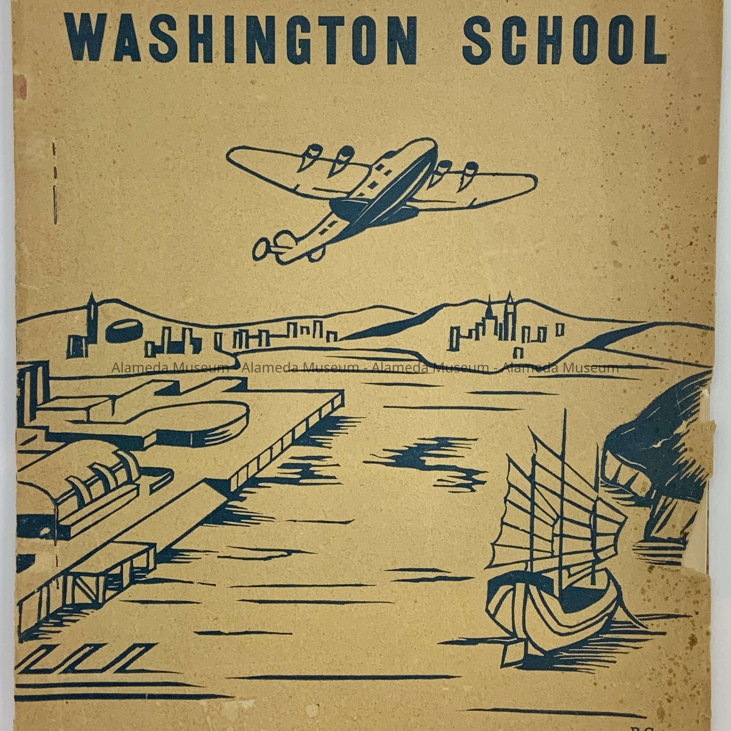 Description: Softbound booklet. Cover has an illustration of an airplane with industry and bold-printed caption, “Washington School” in blue-colored type on a tan-colored background.