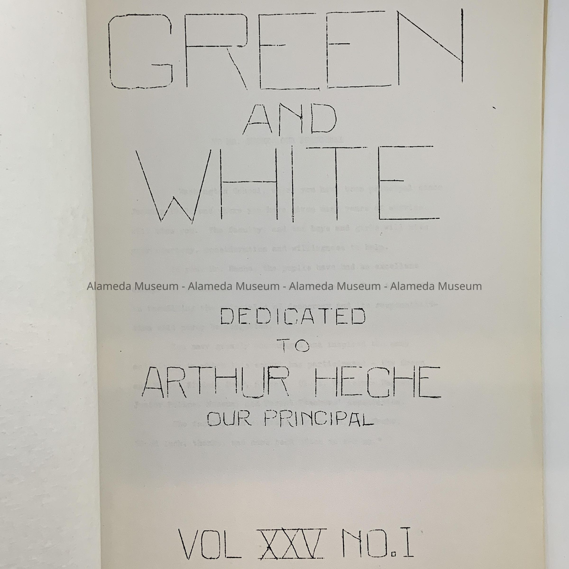 History: Washington School publication entitled, “Green and White" for June 1946. Contains illustration of graduating class for June 1946, a list of graduates and student articles.