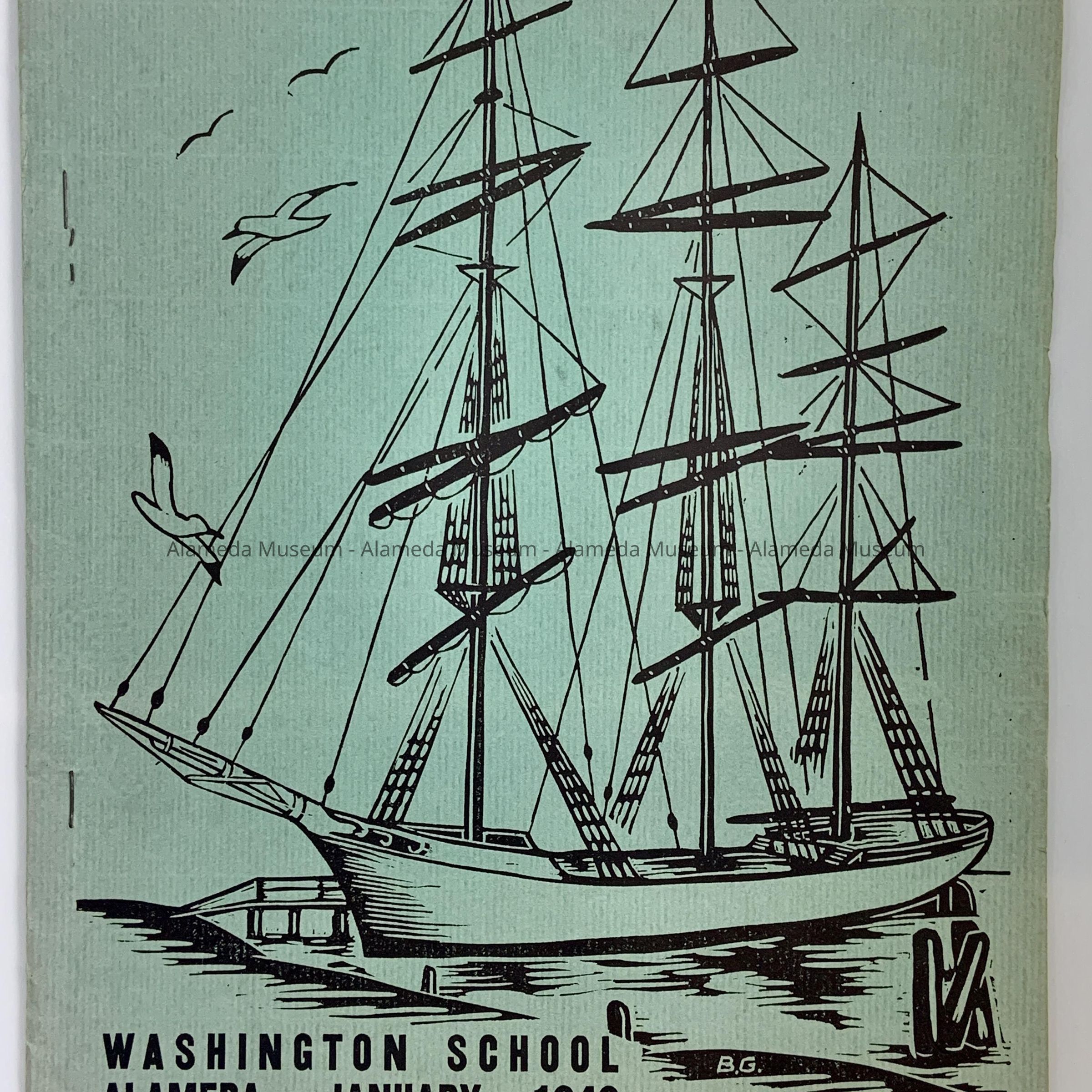 Description: Softbound booklet. Cover has an illustration of a sailing ship and bold-printed caption, “Washington School” on a pale green-colored background.