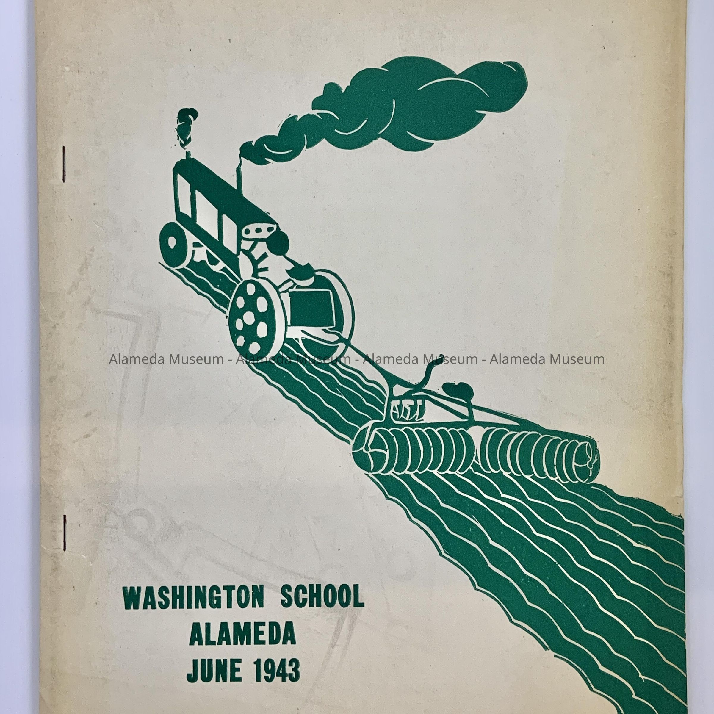 Description: Softbound booklet. Cover has an illustration of a tractor in green-colored type which appears to be silkscreen. Accompanying the illustration is a bold-printed caption, “Washington School, Alameda”.