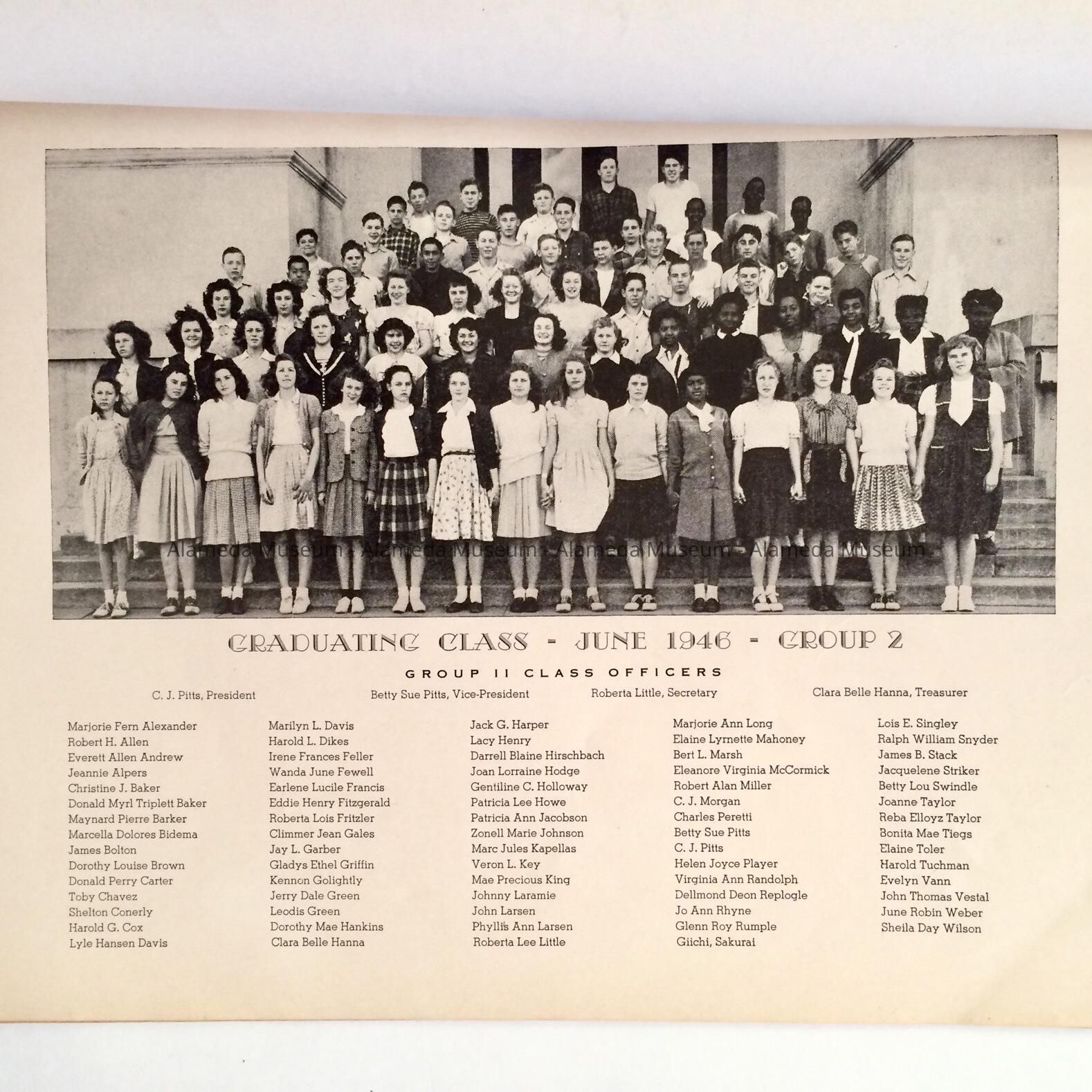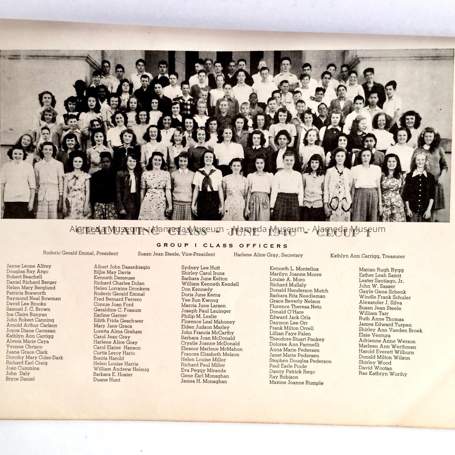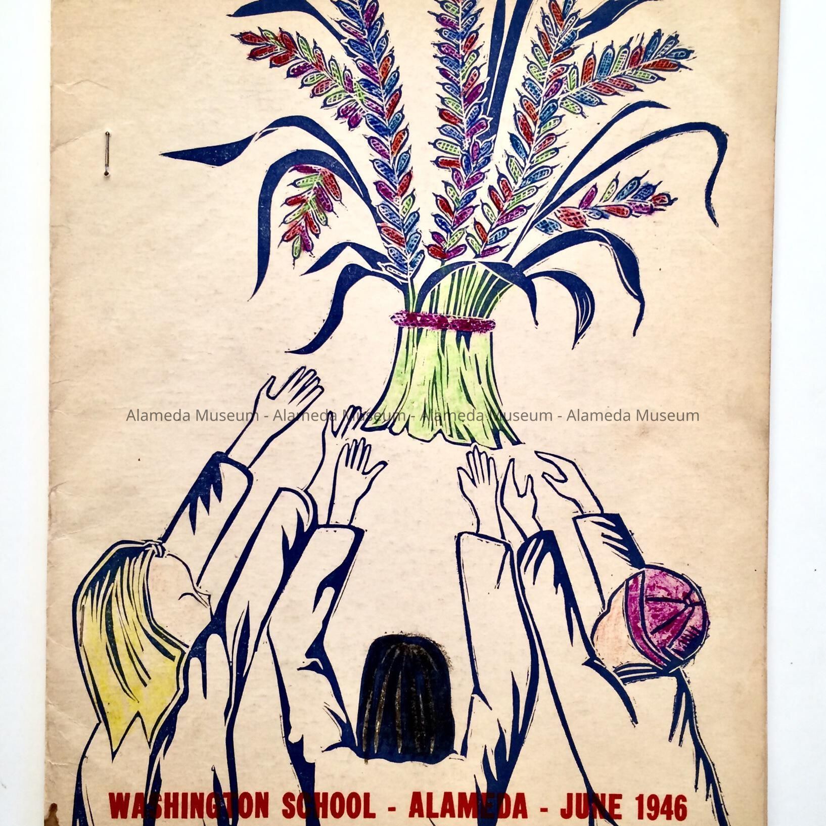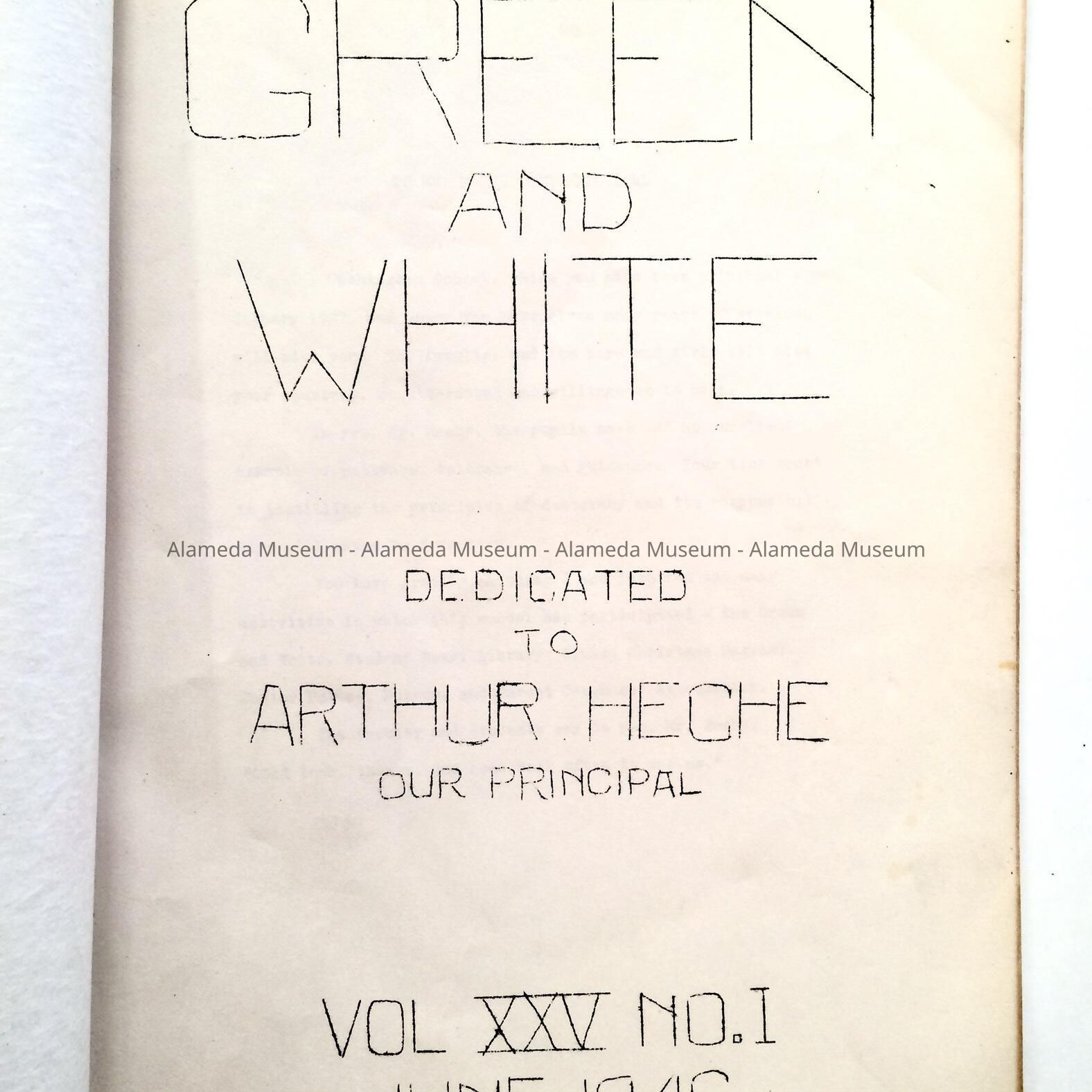 HISTORY OF OBJECT: A PUBLICATION TITLED, "GREEN AND WHITE" FOR JUNE 1946. THIS PARTICULAR EDITION WAS DEDICATED TO MR. ARTHUR HECHE, SCHOOL PRINCIPAL SINCE 1927. MR. HECHE MARRIED THE LATE CAROL TRIPP HAMILTON HECHE, GRANDDAUGHTER OF W.W. CHIPMAN, CO-FOUNDER OF THE CITY OF ALAMEDA. INCLUDED IN THE BOOKLET IS A PHOTOLITHOGRAPHIC ILLUSTRATION OF THE GRADUATING CLASS OF JUNE 1946, GROUP I.