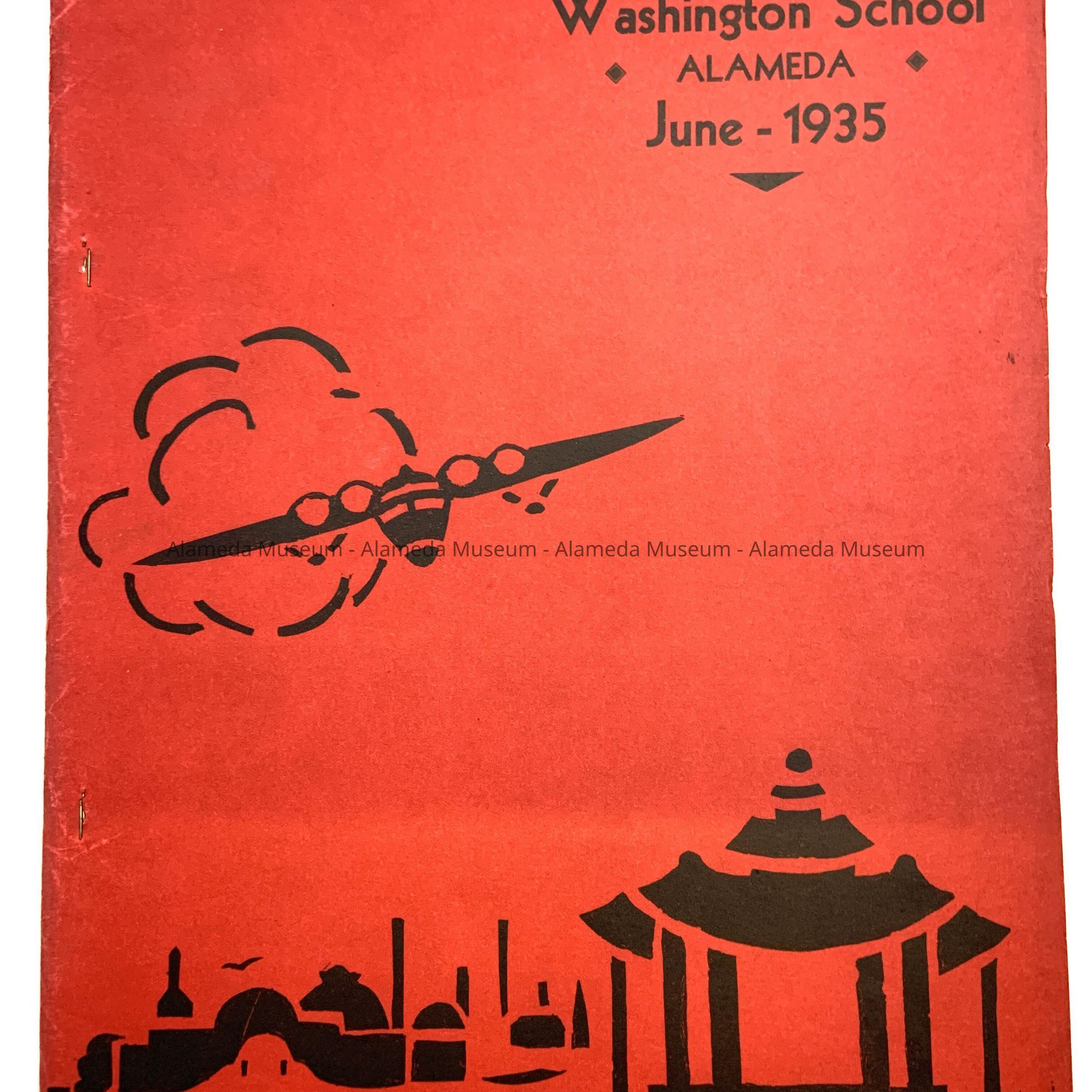 L. RED COVER W/SCENE OF AIRPLANE FLYING OVER BUILDINGS - JUNE 1935