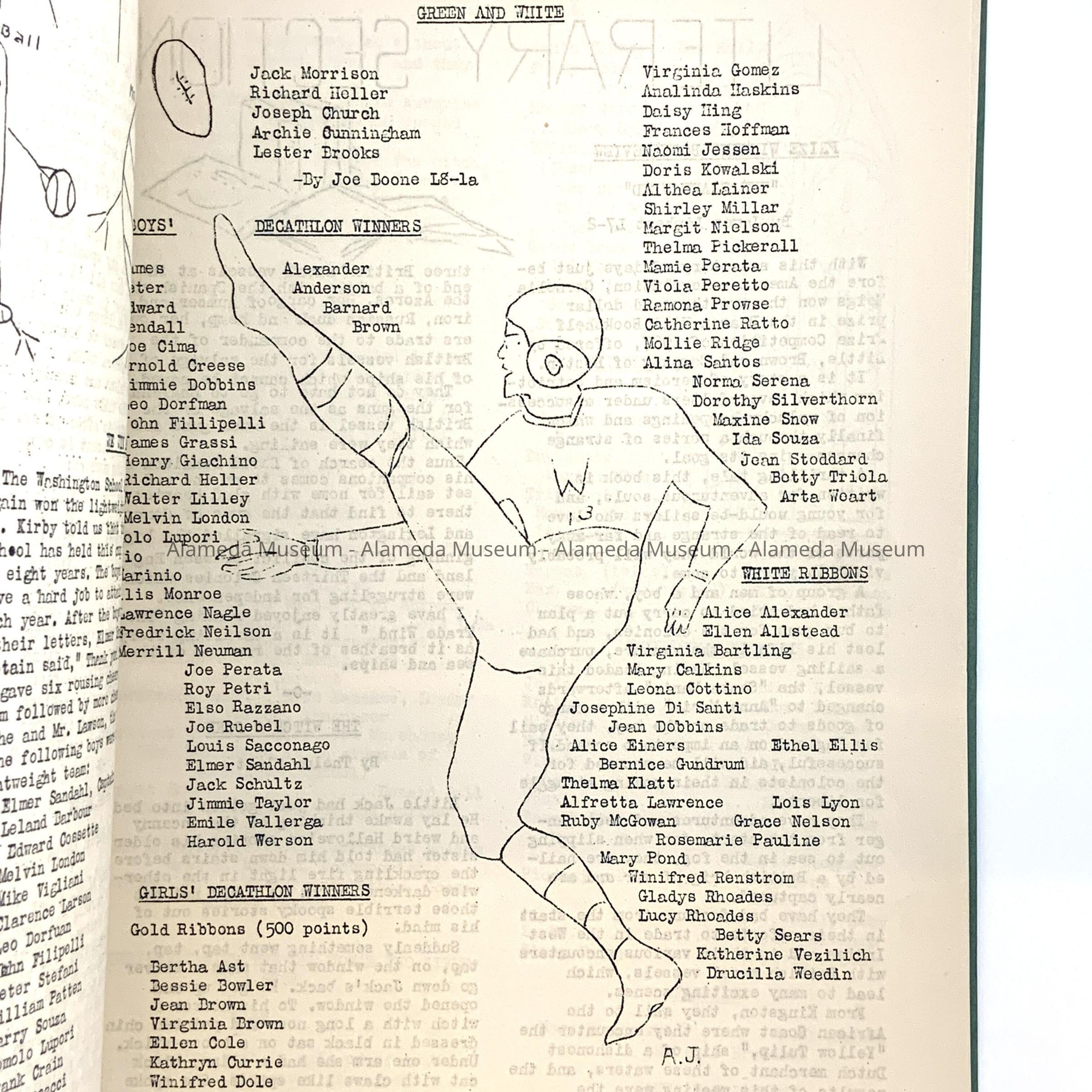 WASHINGTON SCHOOL PUBLICATIONS, KNOWN AS "GREEN AND WHITE." INTRODUCTORY PAGES CONTAIN LISTS OF CLASS OFFICERS AND GRADUATES OF EACH SCHOOL YEAR. TEXTS INCLUDE POEMS, ARTICLES RE SCHOOL EVENTS AND SPORTS ACTIVITIES, ETC. PREPARED BY STUDENT BODY.