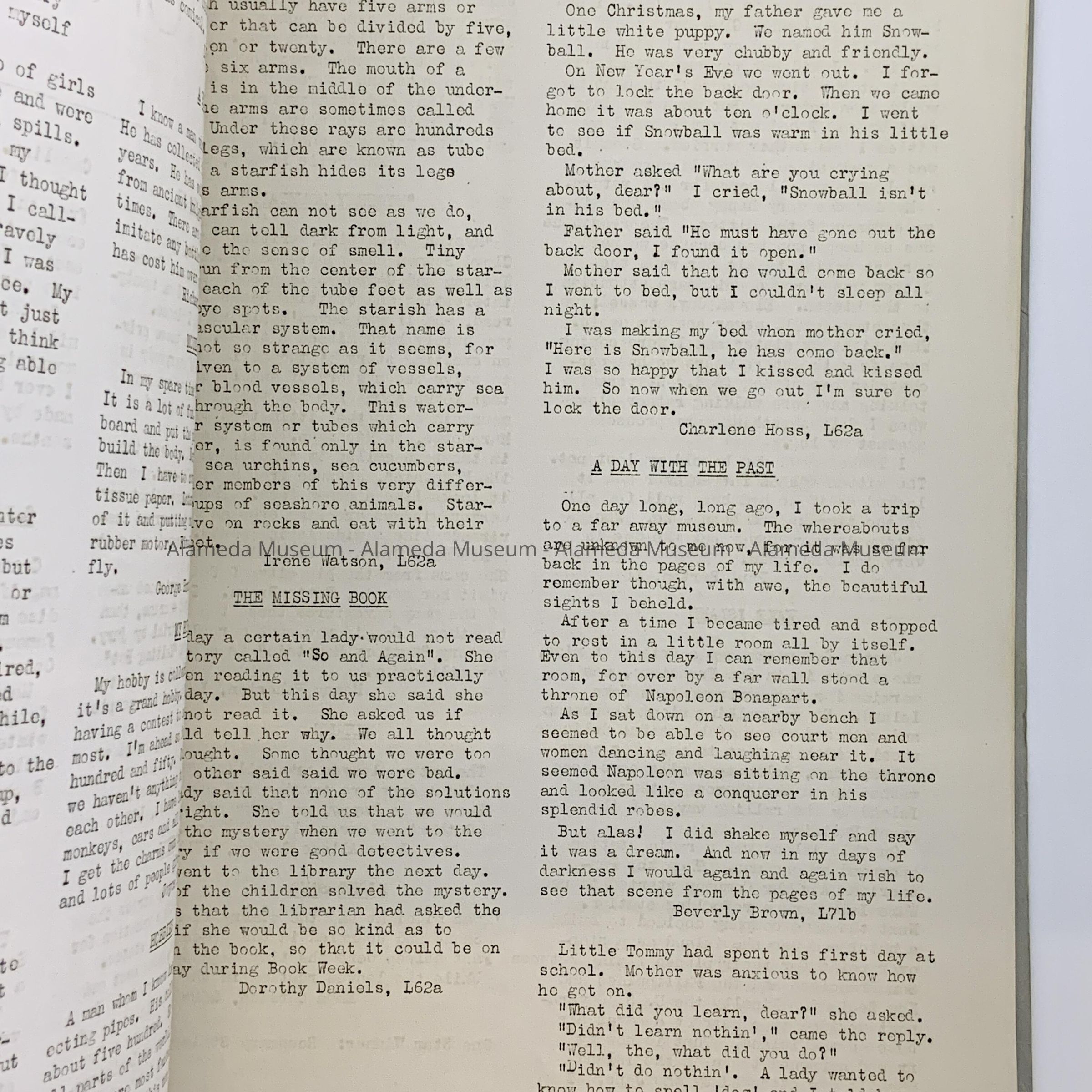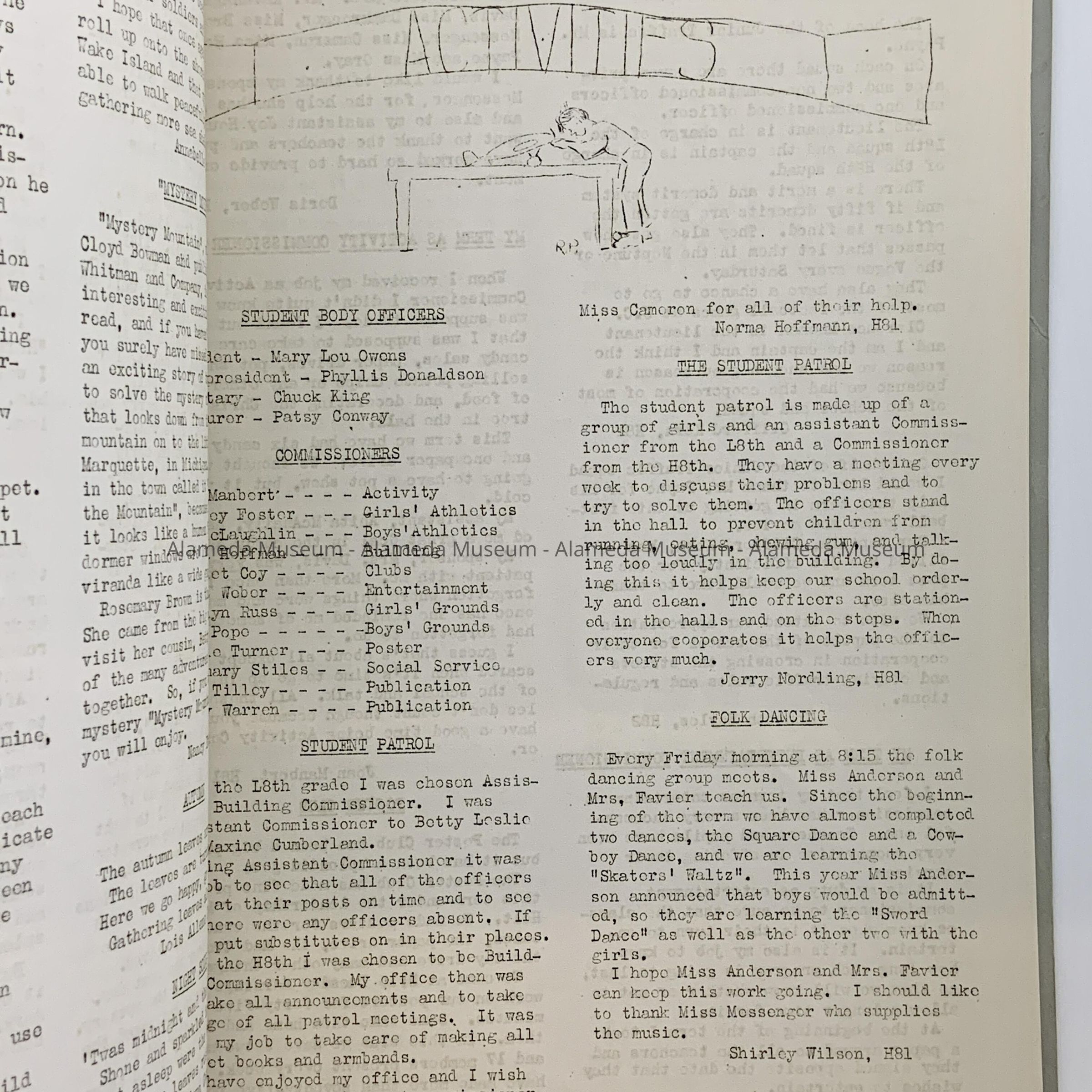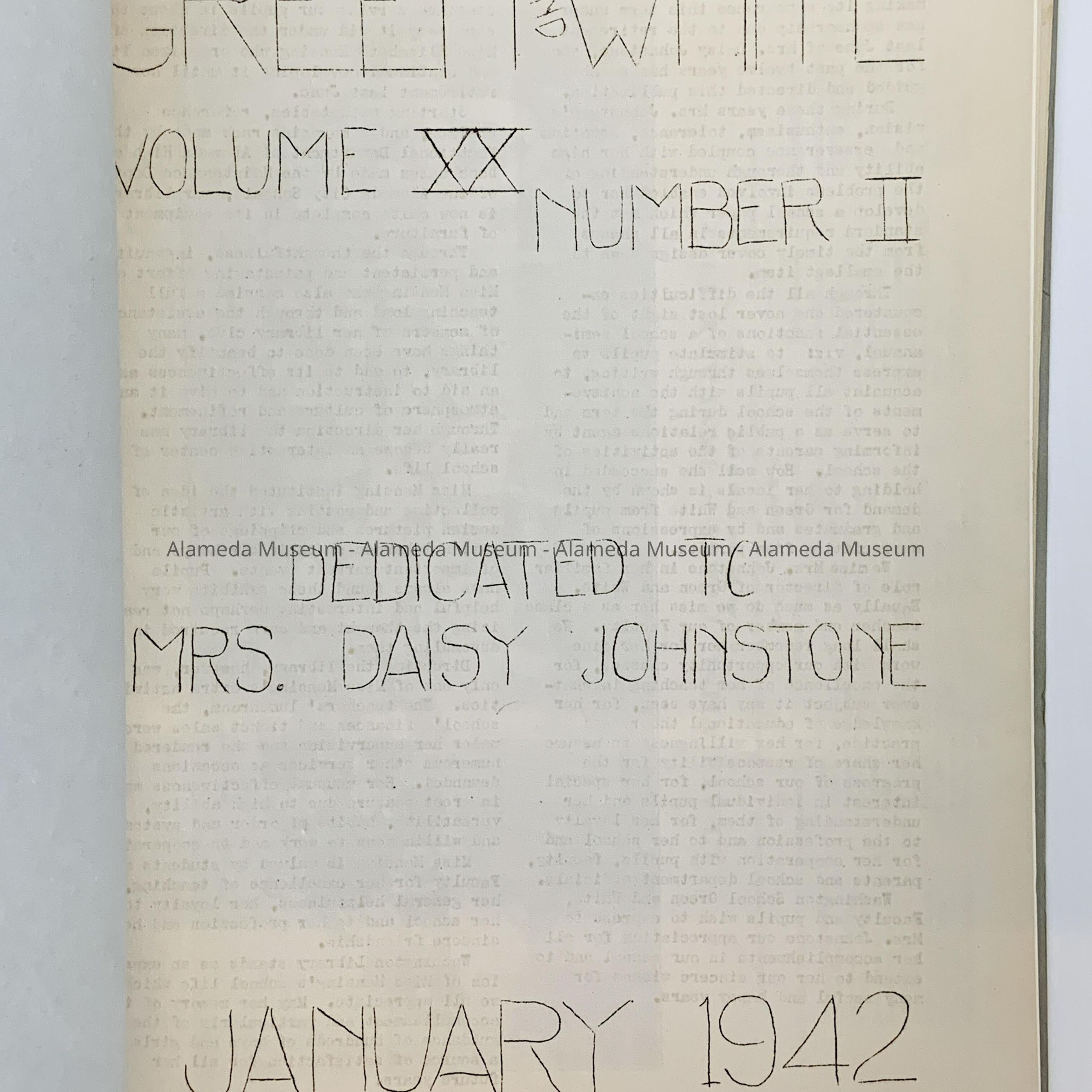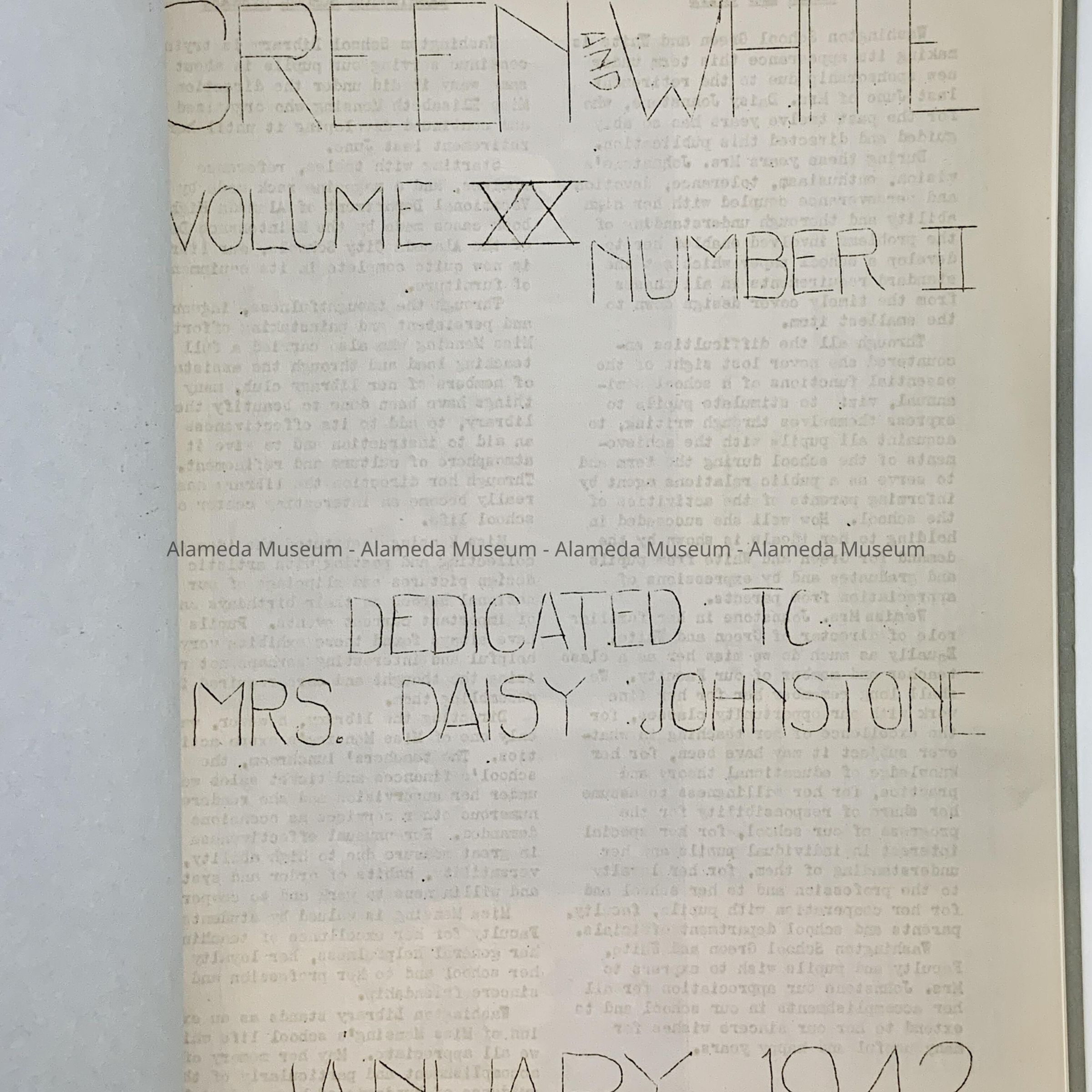 A SCHOOL PUBLICATION ENTITLED, "THE GREEN AND WHITE," ISSUED BY THE STUDENT BODY OF WASHINGTON SCHOOL IN JANUARY 1942. PUBLICATION WAS GIVEN TO THE ALAMEDA HISTORICAL SOCIETY PRIOR TO 1971 AND NOT CATALOGED UNTIL TODAY,