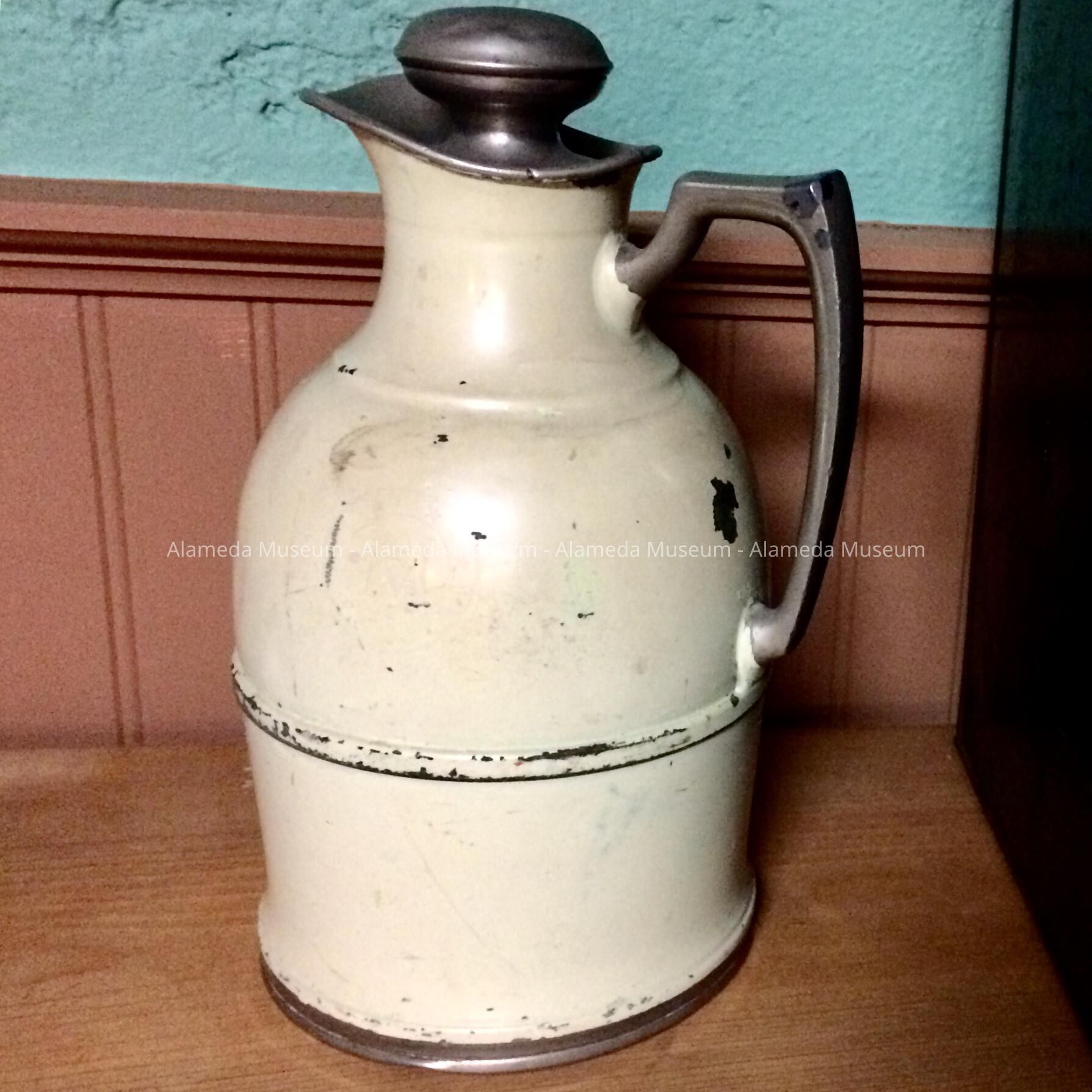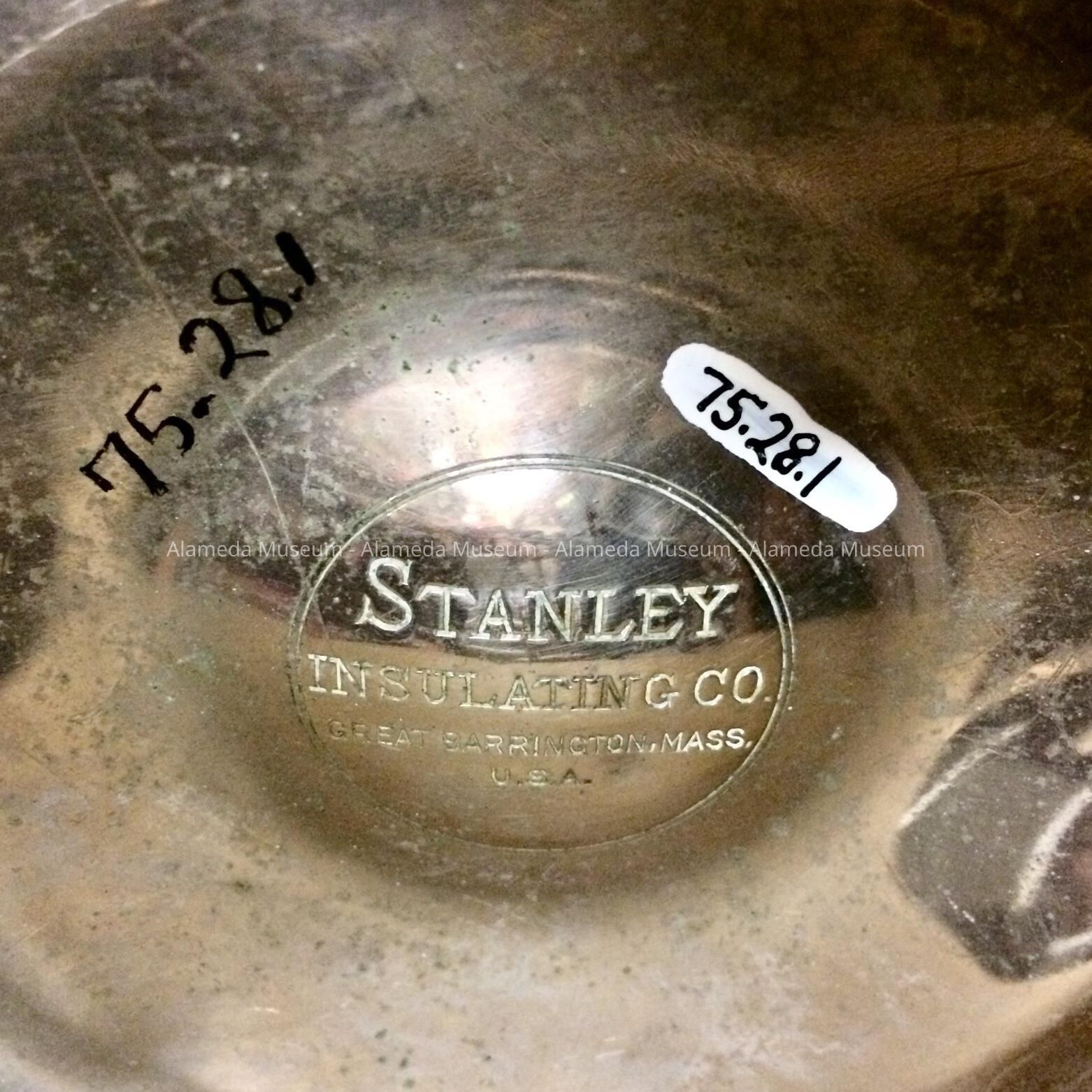 DESCRIPTION: WATER BOTTLE (OR PITCHER) WITH STOPPER. NICKEL PLATED HANDLE, SPOUT AND STOPPER. BODY OF JUG ENAMELED YELLOW PAINT. BLUE ENAMELED LINER. SIGNED ON BOTTOM "STANLEY INSULATING CO., GREAT BARRINGTON, MASS., U. S. A.