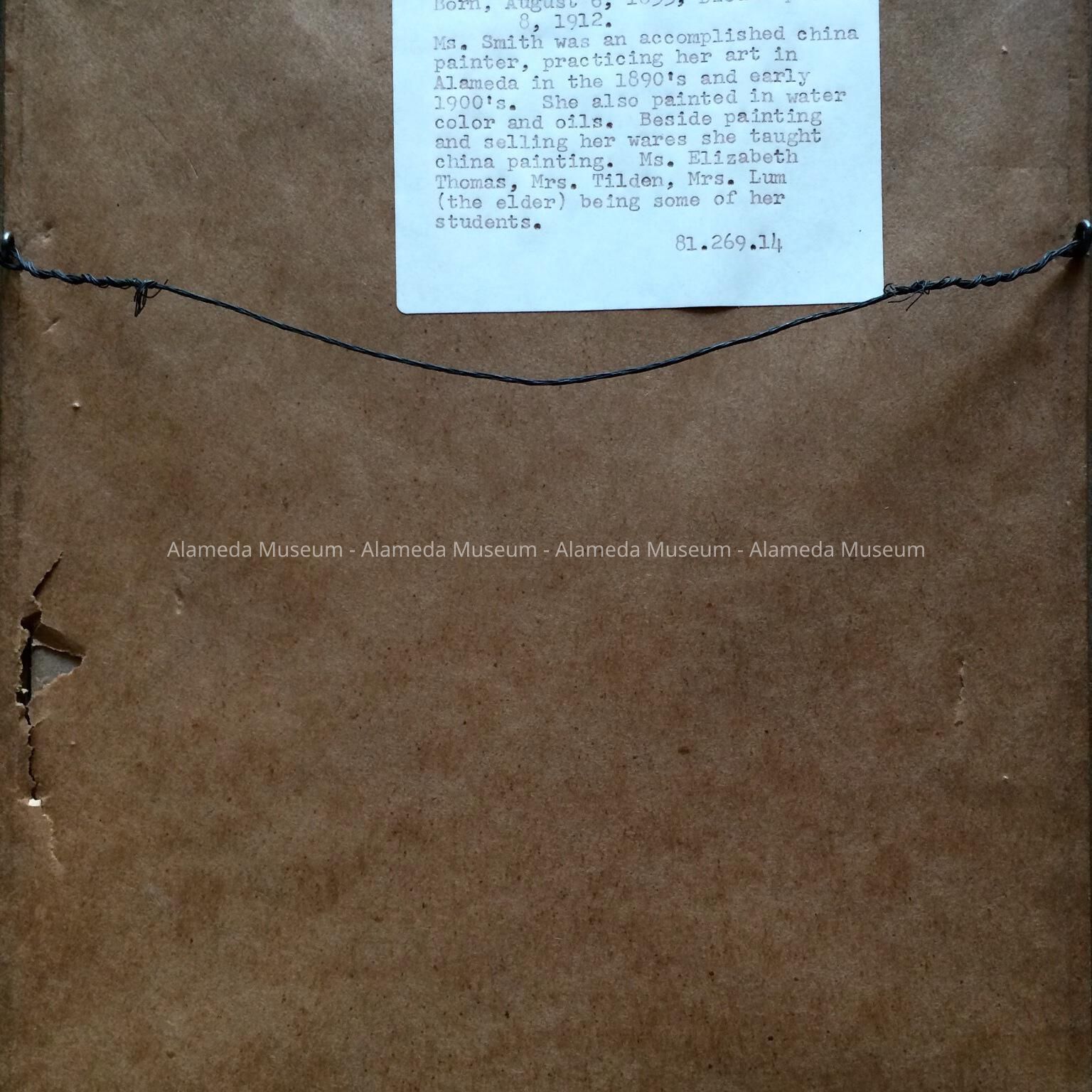 Ms. Smith was an accomplished china painter, practicing her art in Alameda in the 1890's and early 1900's. She also painted in water color and oils. Beside painting and selling her wares she also taught china painting. Ms. Elizabeth Thomas, Mrs. Tilden, Mrs. Lum (the elder) being some of her students.