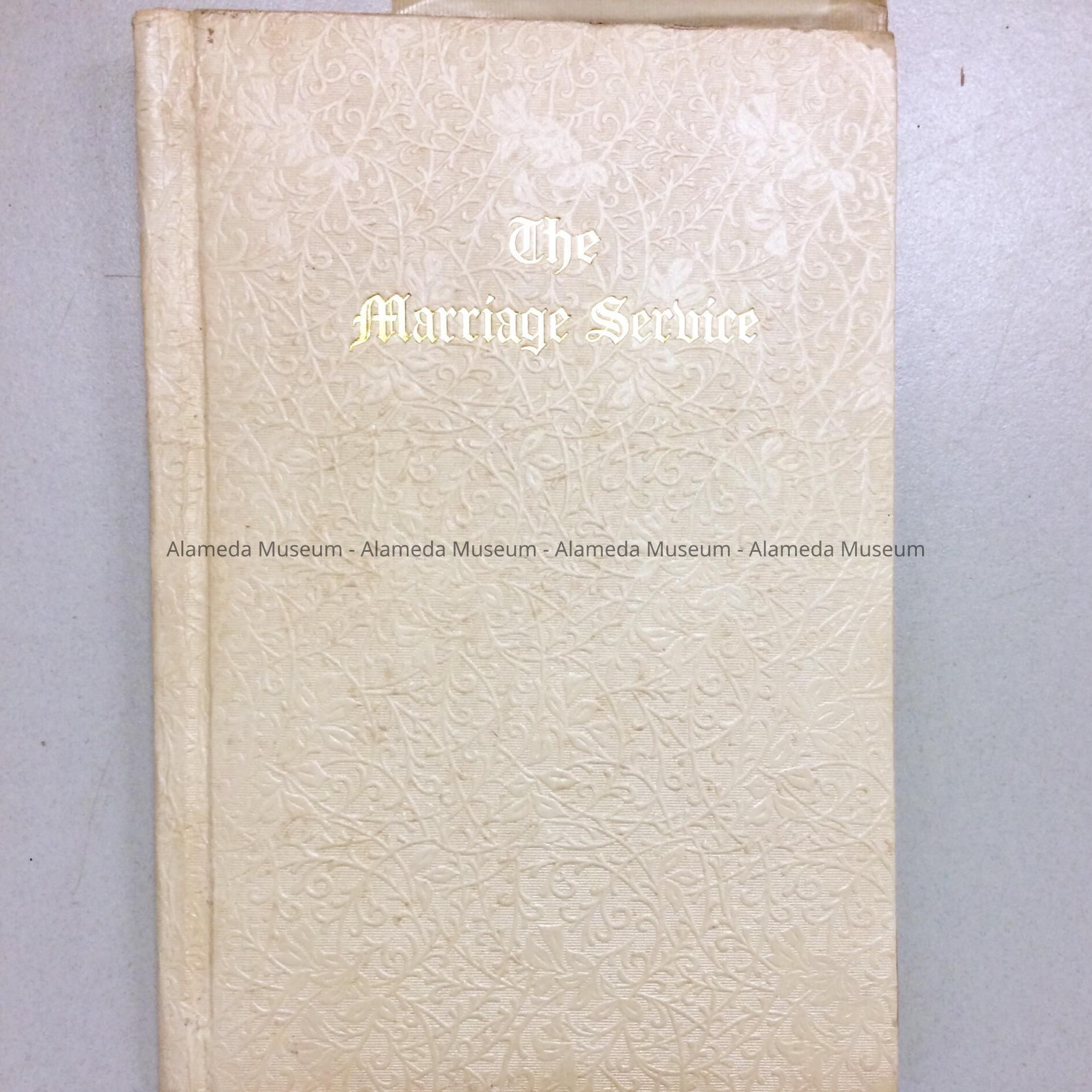 DESCRIPTION: A HARD-BOUND BOOK WITH EMBOSSED DESIGNS ON THE COVER AND THE CAPTION, "THE MARRIAGE SERVICES," IN GOLD-COLORED TYPE ON AN OFF-WHITE COLORED BACKGROUND. TITLE PAGE HAS AN INFORMATION SEGMENT THAT HAS BEEN INSCRIBED IN BLUE COLORED INK.