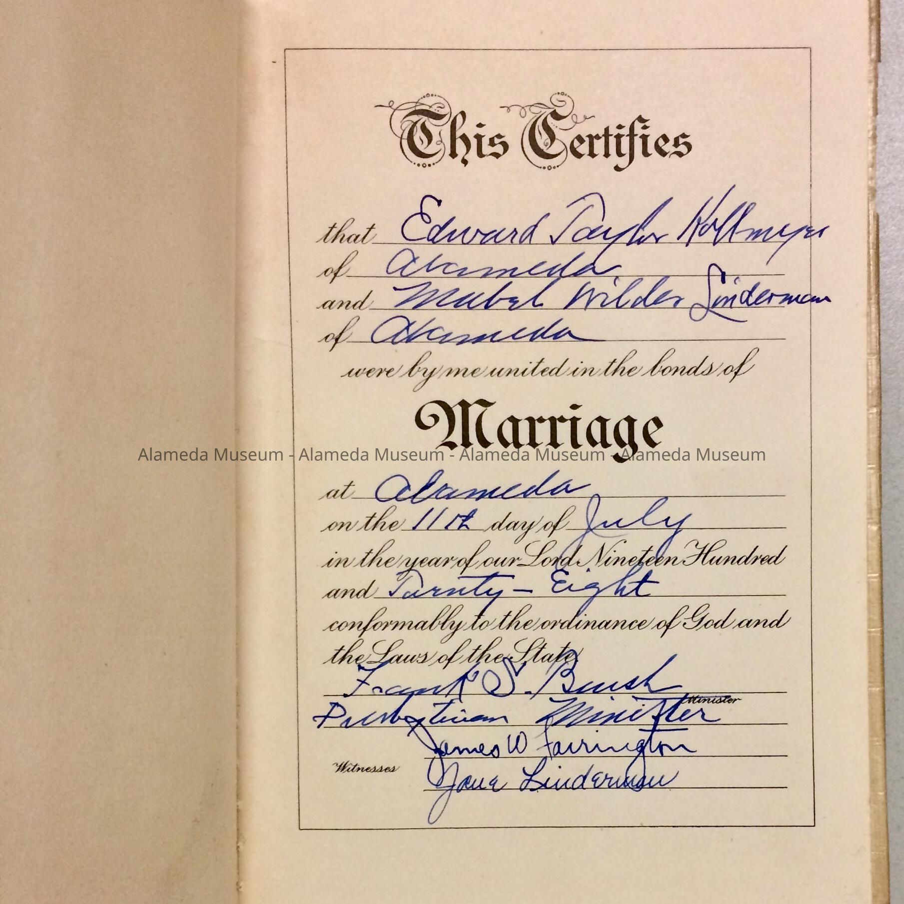 HISTORY OF OBJECT: A WEDDING BOOK OF EDWARD TAYLOR KOLLMYER AND MABEL WILDER. MARRIAGE WAS PERFORMED ON JULY 11, 1928. FRANK S BRUSH, PRESBYTERIAN MINISTER, PRESIDED.