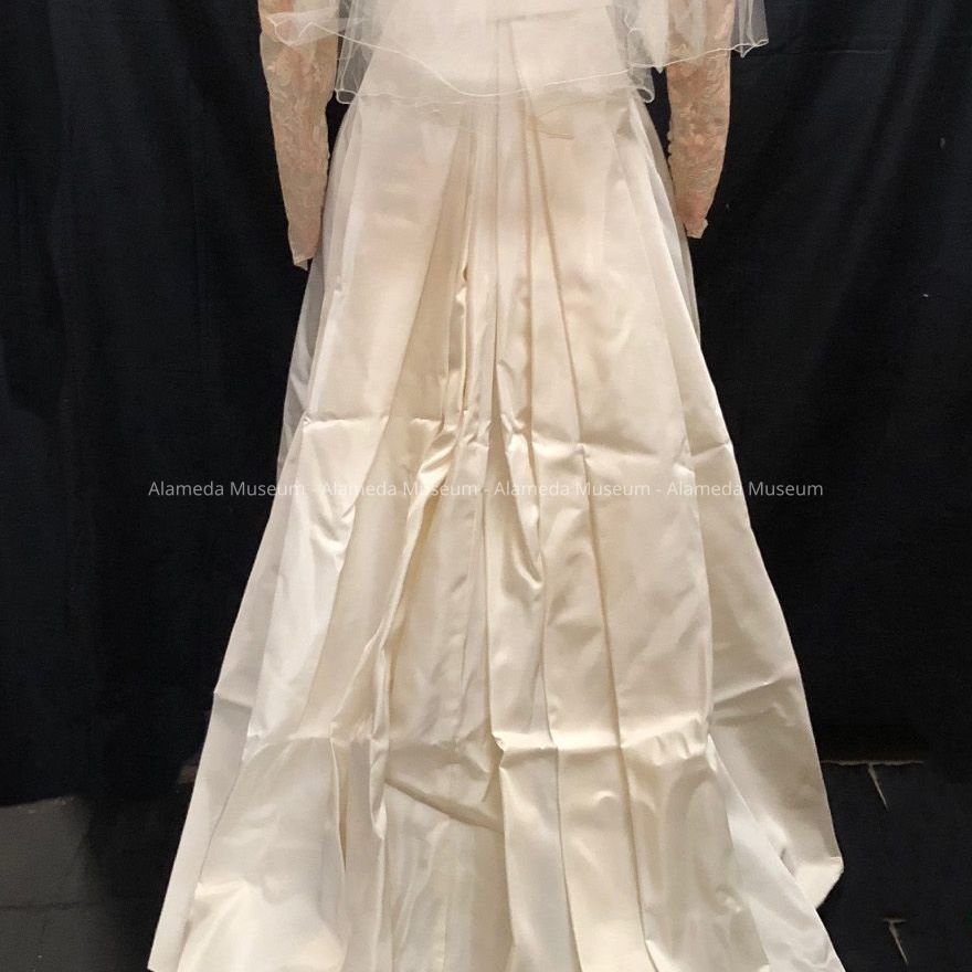 Floor-length wedding dress of white polyester satin with lace overlay on the bodice and along the center of the skirt. The bodice and upper skirt are beaded. Sleeves are long and lace. Wide scalloped neckline and high waist with band. Overskirt attaches to the back band with hooks and loops. Veil is short shoulder-length of tulle with a crown of rosettes. The long second veil is ecru and edged with machine lace. It has hooks at snaps at the top and does not match the dress or other components. No labels.