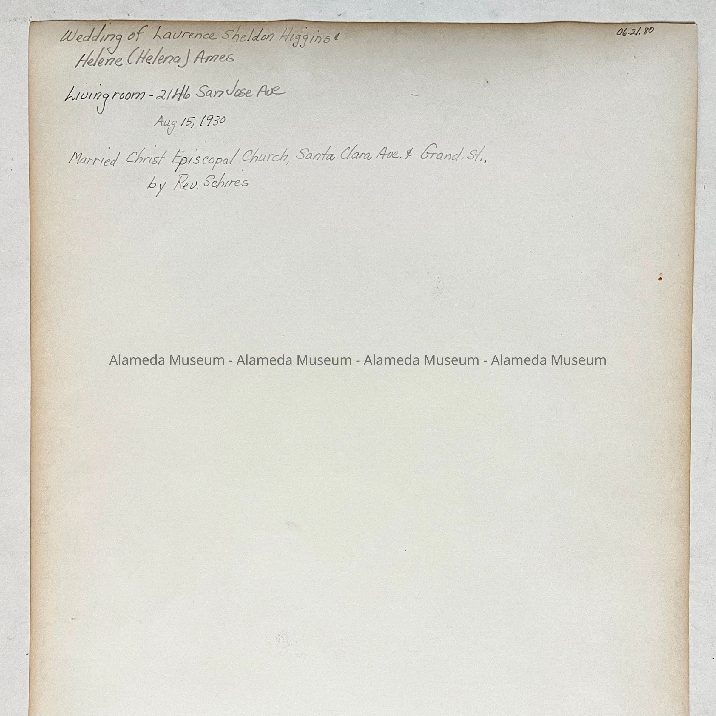 A WEDDING PHOTOGRAPH UPON THE OCCASION OF THE MARRIAGE OF HELENE AMES TO LAWRENCE SHELDON HIGGINS. THE PHOTOGRAPH WAS TAKEN IN THE LIVING ROOM OF THE AMES-FORSYTHE HOME AT 2146 SAN JOSE AVENUE, ON AUGUST 15, 1930.