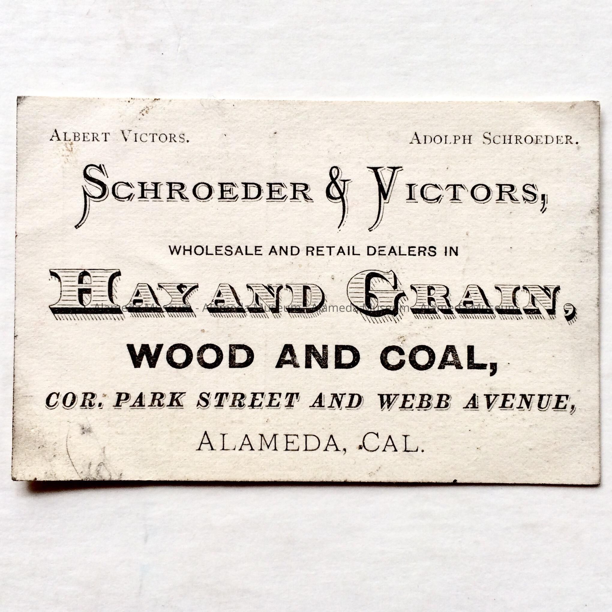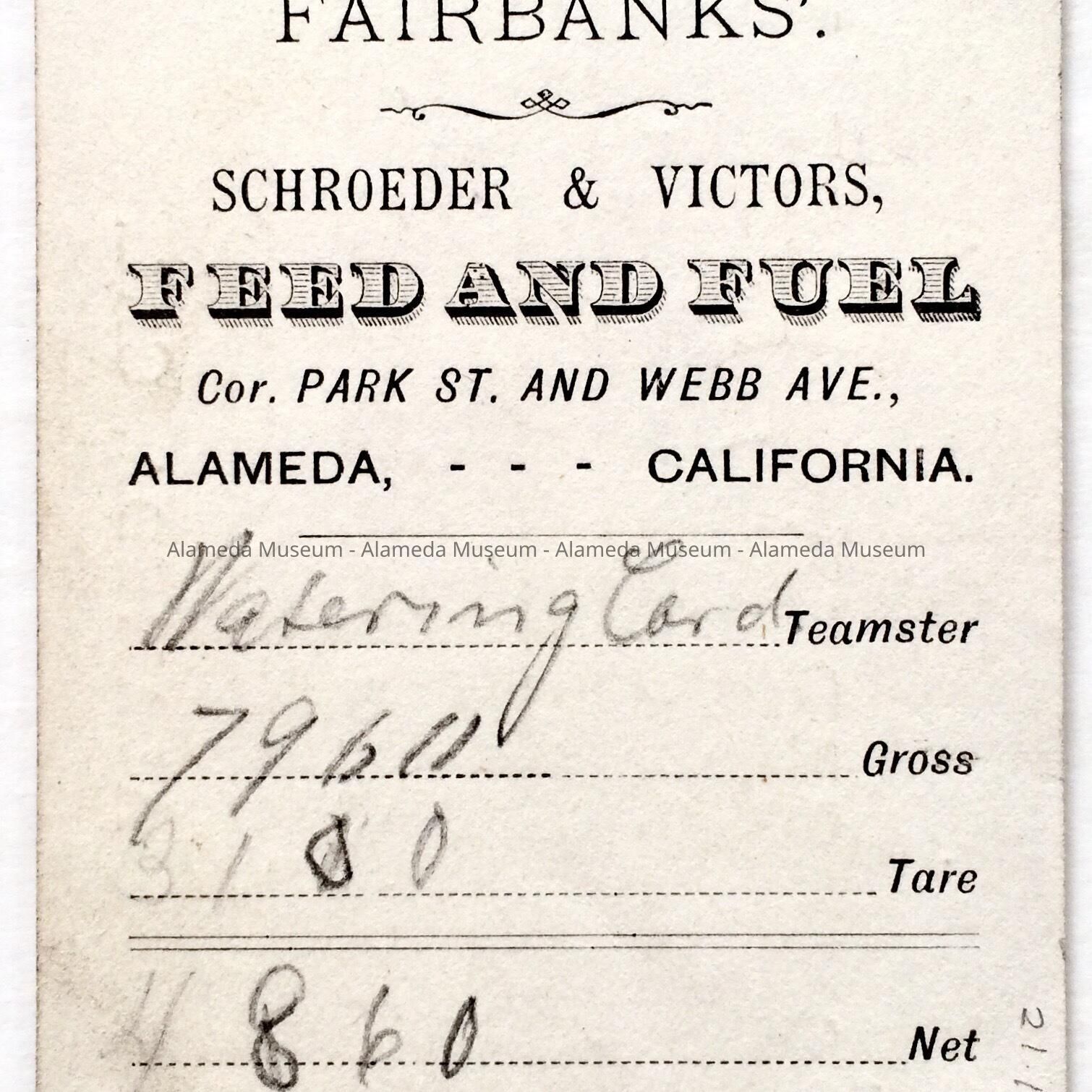 History of Object: Weighing card from Schroeder & Victors, owners Adolph Schroeder (c. 1828-1892) and his nephew Albert Victors (1842-1904). Schroeder had immigrated from Germany and had operated a coal business in San Francisco, and came to live in Alameda around 1874. He then built a building on the corner of Park Street and Santa Clara (called the ‘Schroeder building’, 1876). In 1880 he started the hay, feed, coal etc. business on the corner of Park and Webb with his nephew. Victors married and moved, first to 1610 Walnut, later to 1018 Paru Street, which house still stands. The Schroeder family home on 1580 Lincoln was torn down and a new building was built in its place in 1925.