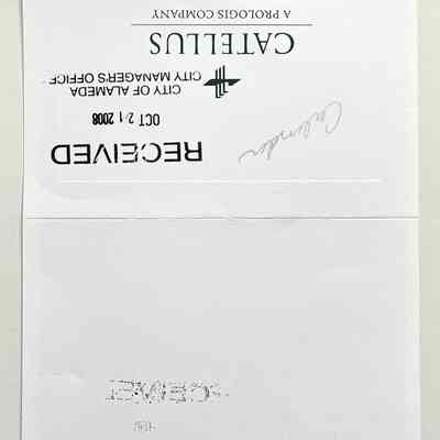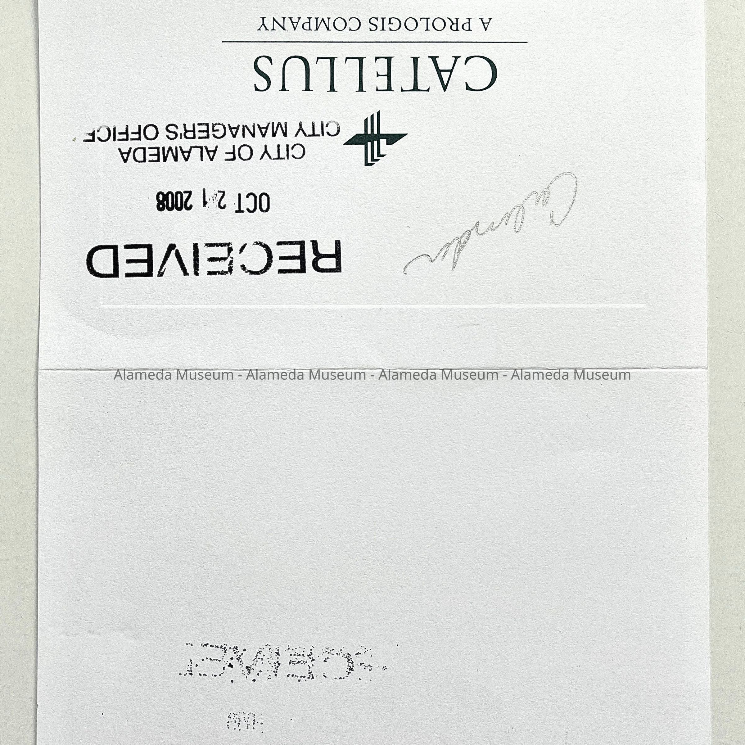 Backing card has ‘Catellus’, and is stamped ‘Received October 21, 2008, City of Alameda, City Manager’s Office’.
