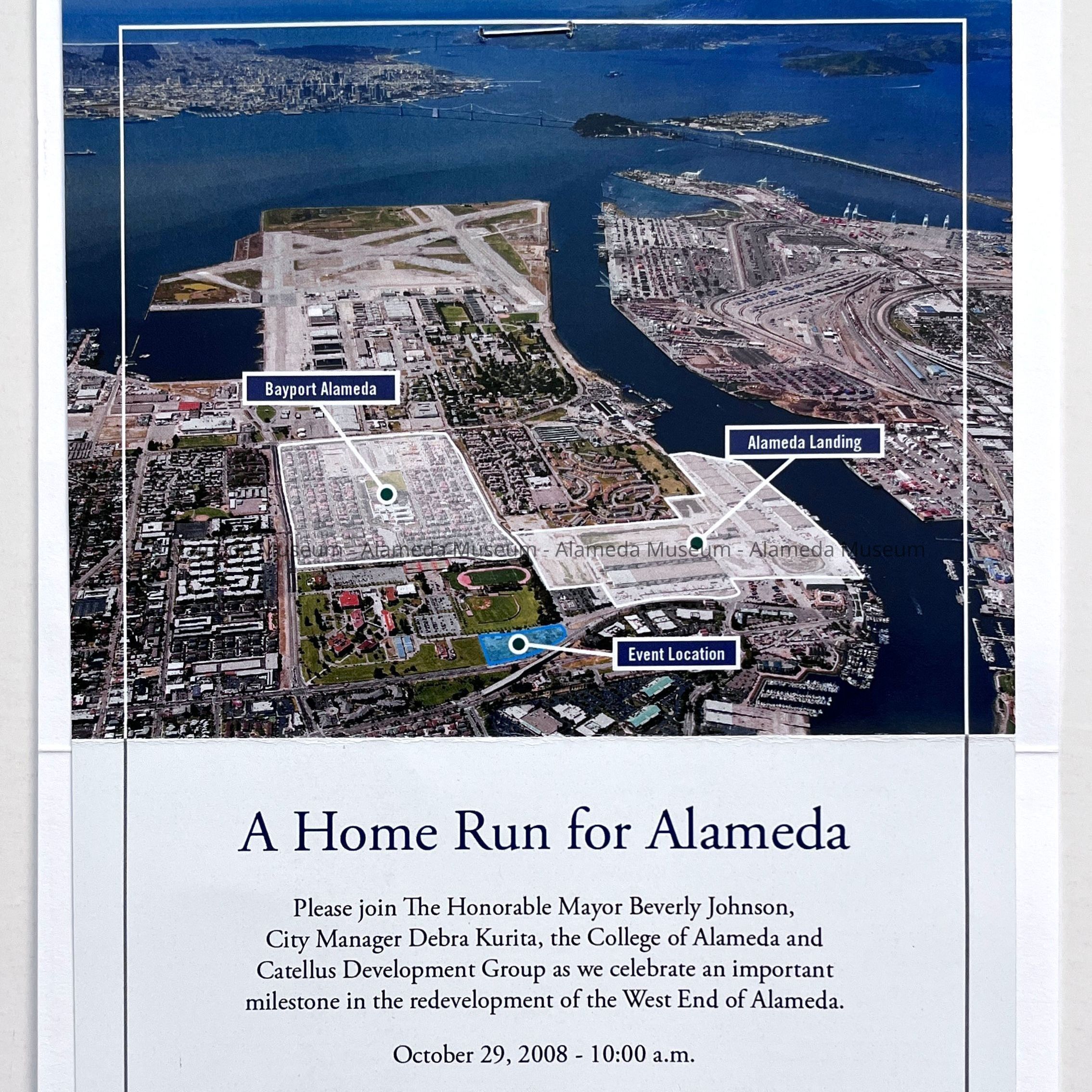 History of Object: invitation celebration, on October 29, 2008, for a ‘Home Run’ milestone in the development of the former Naval Air Station at the West End of Alameda, of ‘Alameda Point’, at the time that the Catellus Development Group was involved in the plans. The invitation cites Mayor Beverly Johnson and City Manager Debra Kurita as co-hosts to Catellus.