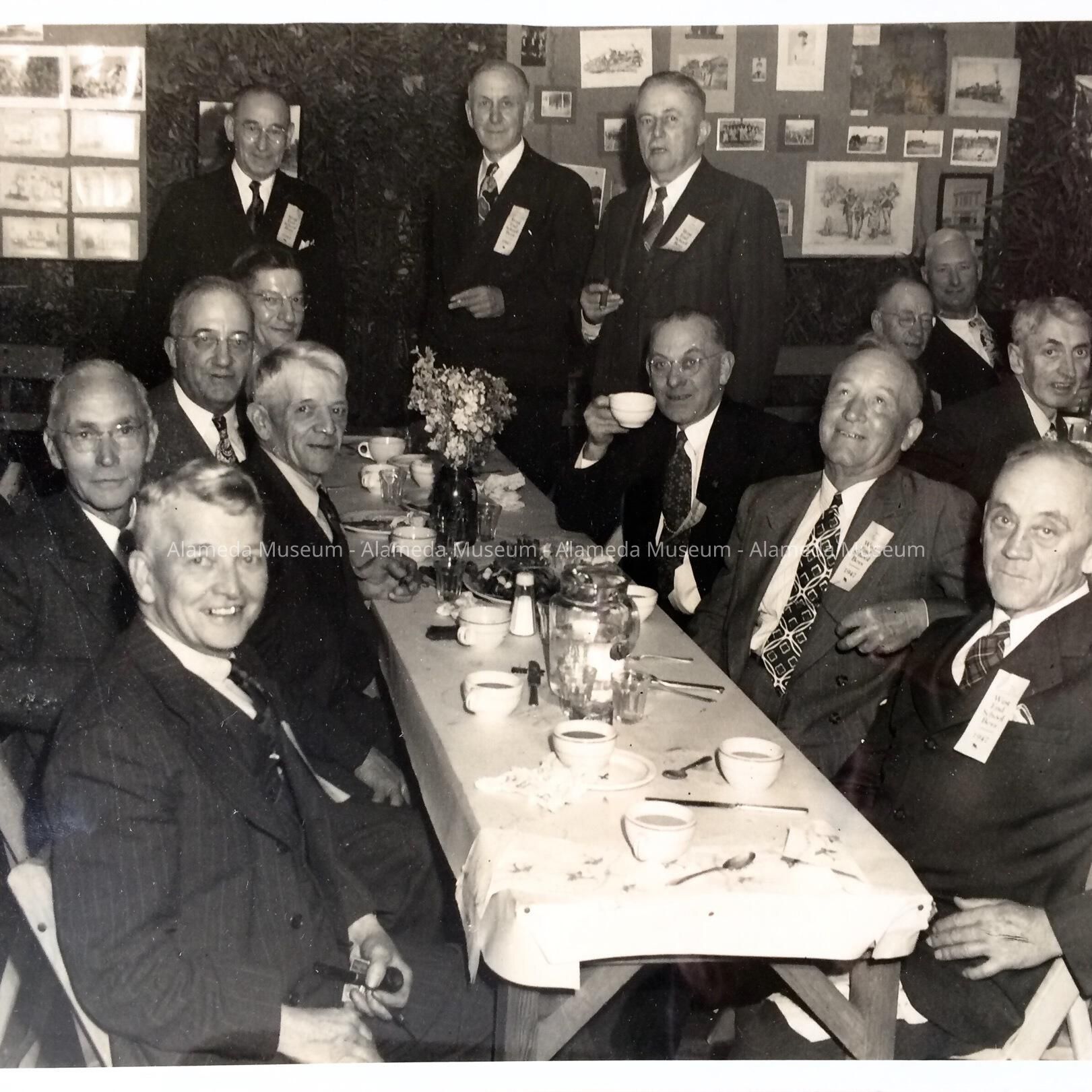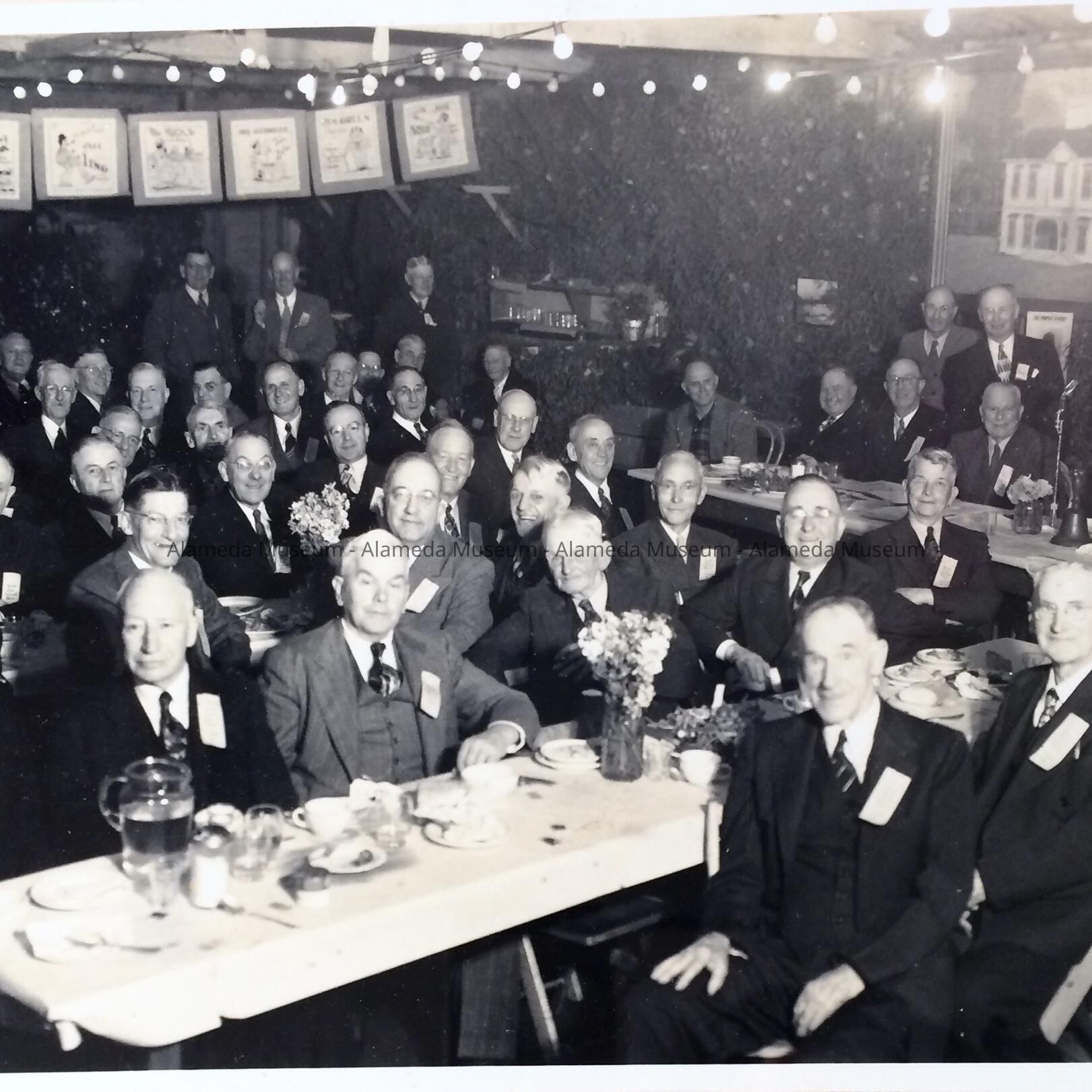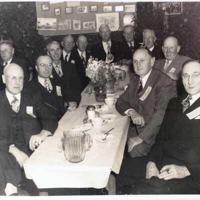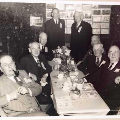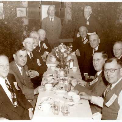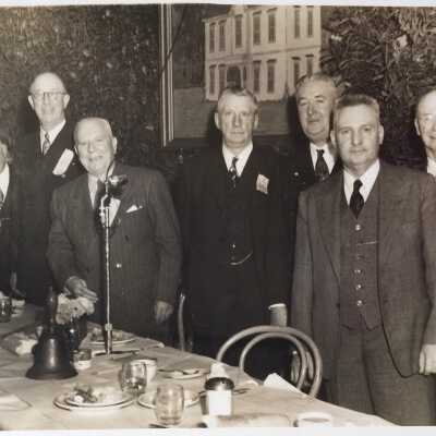 History of Object: Group photo of the West End School Boys reunion and dinner, 1947. This was a club of men who had attended the West End Grammar School, prior to its name being changed to Longfellow.