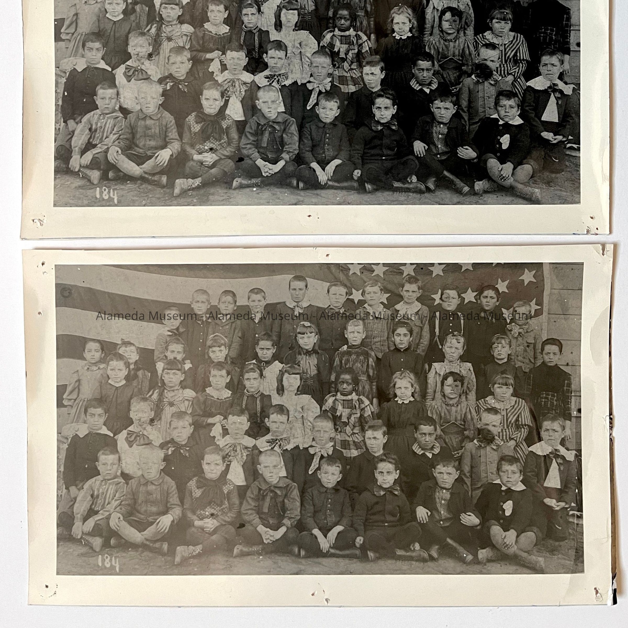History of Object: School class photo taken in front of a U.S. flag backdrop. The year, grade, and students' names are unknown. Two different photos of the same class.