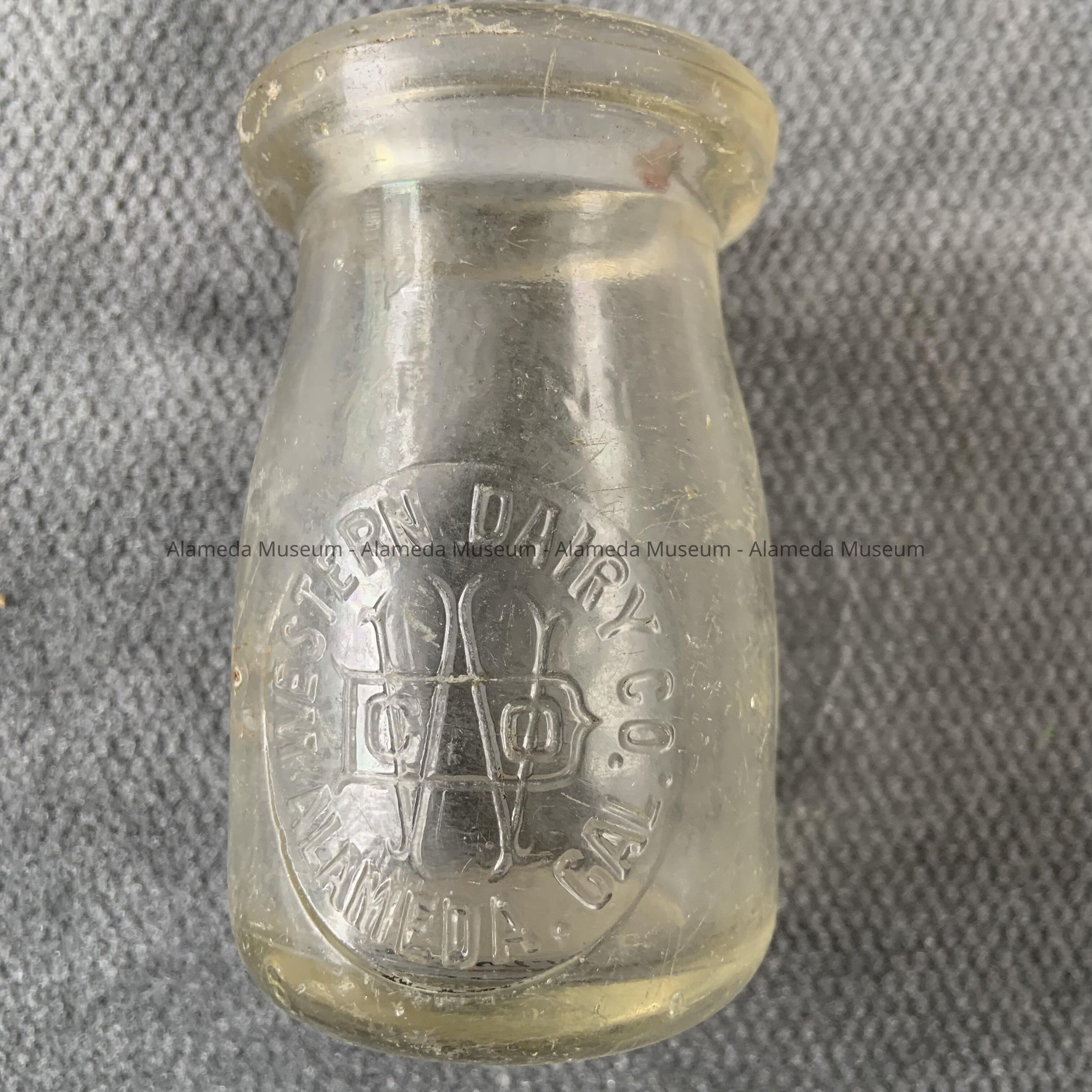 Description: Cream bottle, raised lettering in circular-like label stating "Western Dairy Co, Alameda, Cal", and trade mark of a large letter "W" with a letter "D" impressed over it, and Co, added. The bottle has a protruding lip with recessed ledge for supporting paper top.