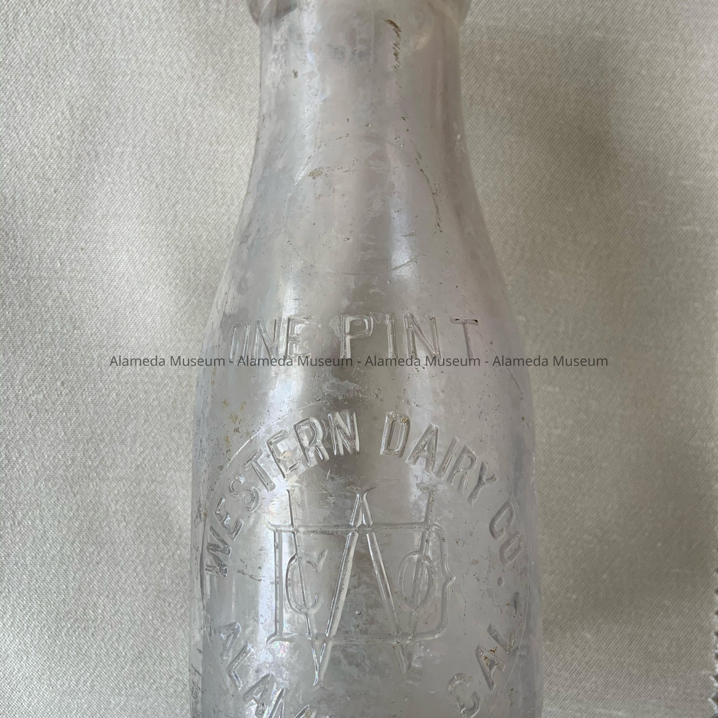 Pint milk bottle, raised lettering in circular like label stating "Western Dairy Co, Alameda, Cal", and trademark of a large letter w stamped over a D, & c, o. Western Dairy Co., is also stamped in raised letters on the bottom of the bottle. One pint is printed above the label. The bottle has a protruding lip with recessed ledge for supporting paper top.