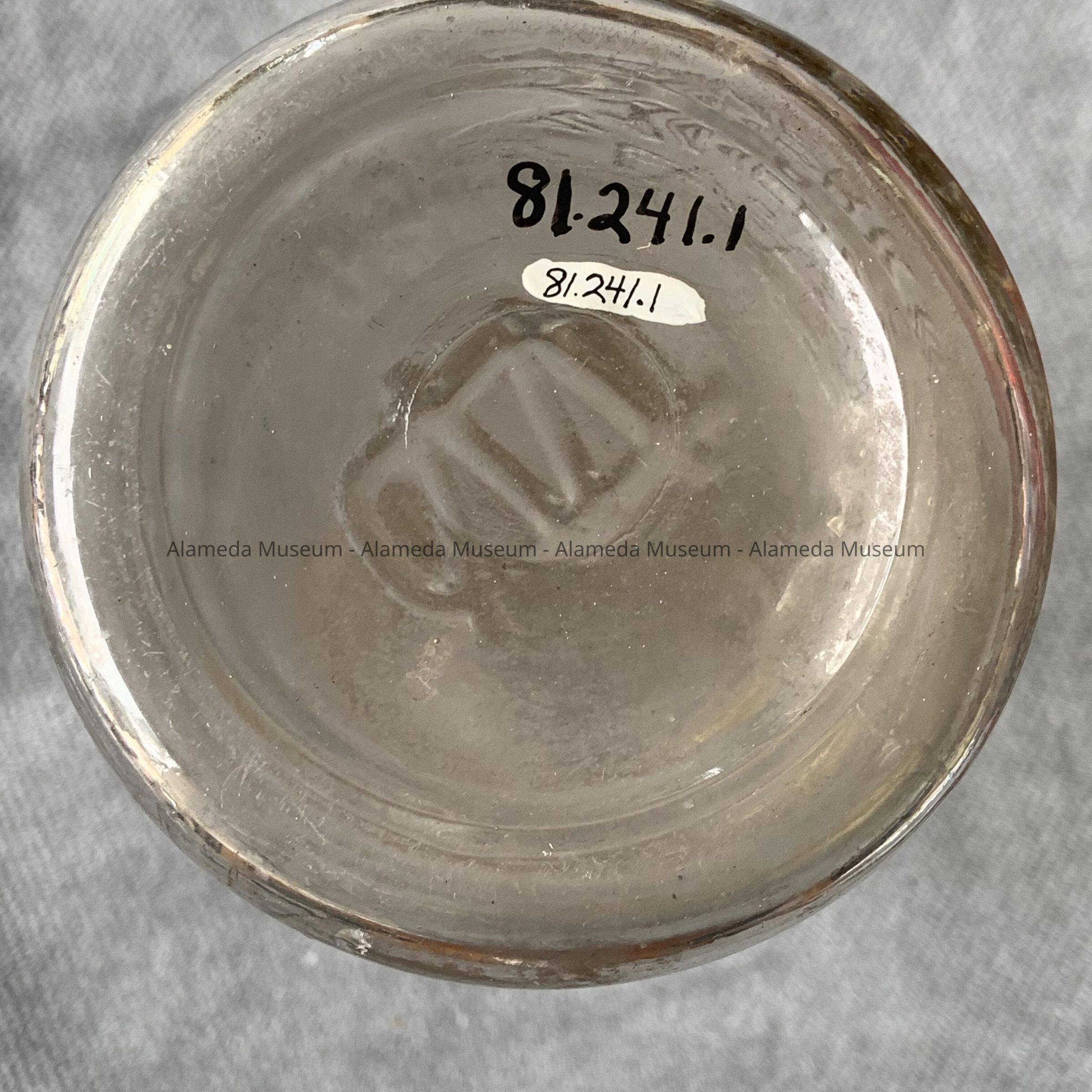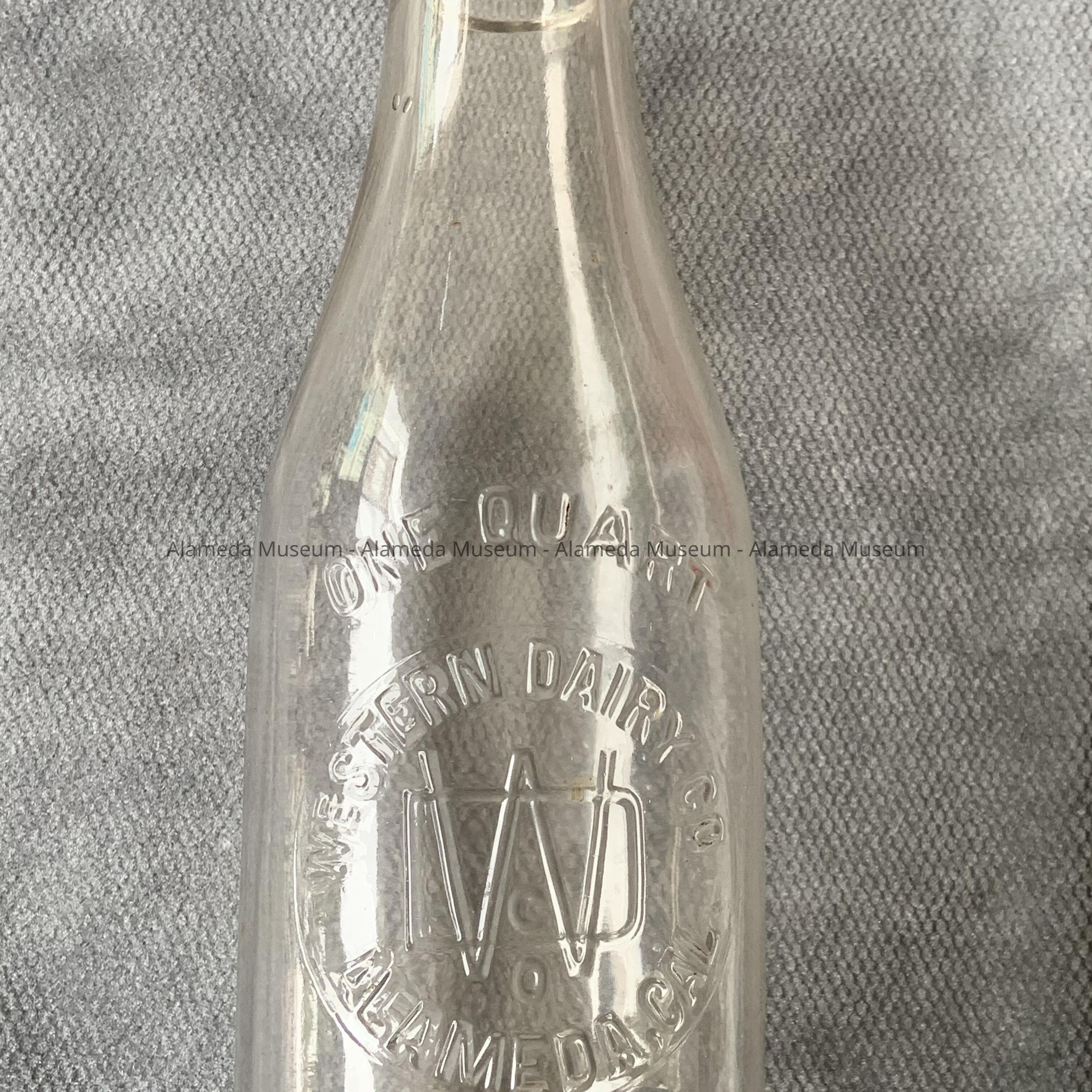 Description: Double mold clear glass bottle, raised lettering and insignia "Western Dairy Company, Alameda, Cal." one quart". The insignia is a W printed over a D including Co. The bottle has a protruding, lip with recessed ledge for supporting paper top.