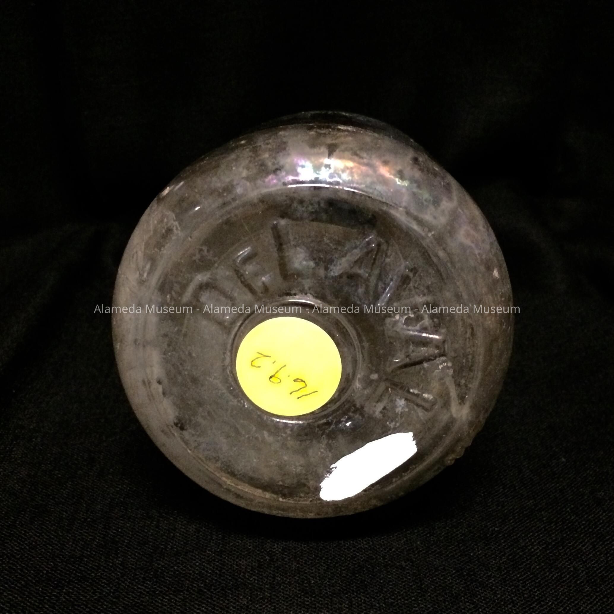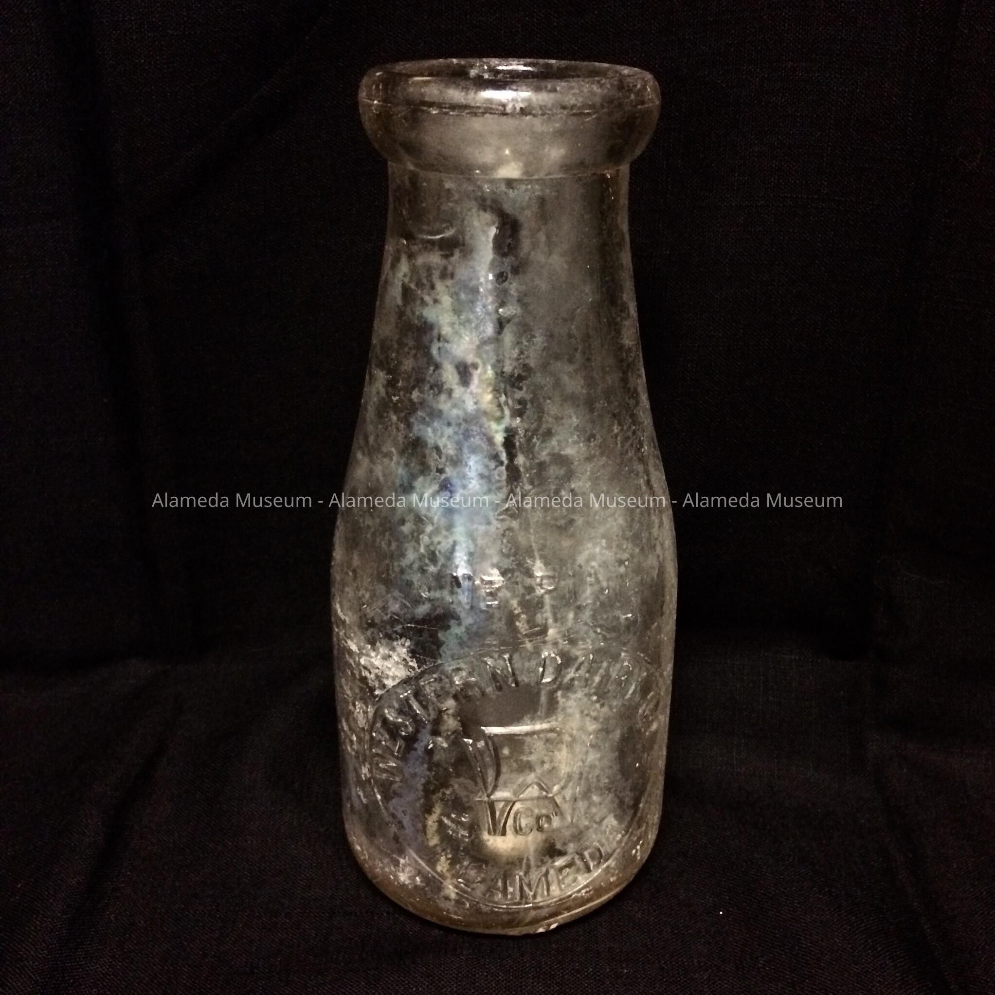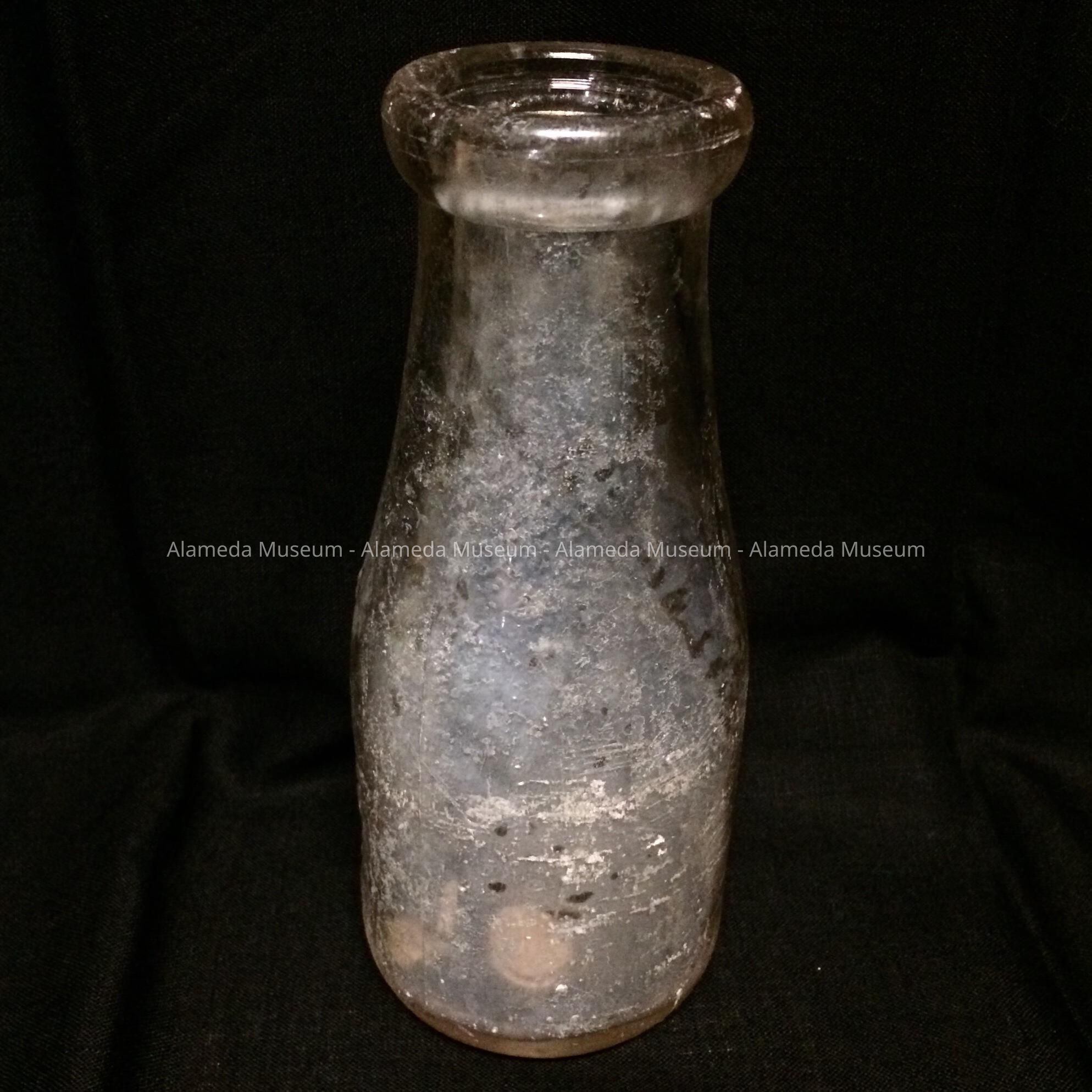 HISTORY OF OBJECT: AN EMBOSSED MILK BOTTLE WITH AN IRIDESCENT SURFACE CAUSED BY EXPOSURE TO EARTH, SALT WATER, ETC. THE BOTTLE WAS EXCAVATED BY THE DONOR FROM THE OLD ALAMEDA CITY DUMPS ON BAY FARM ISLAND.
