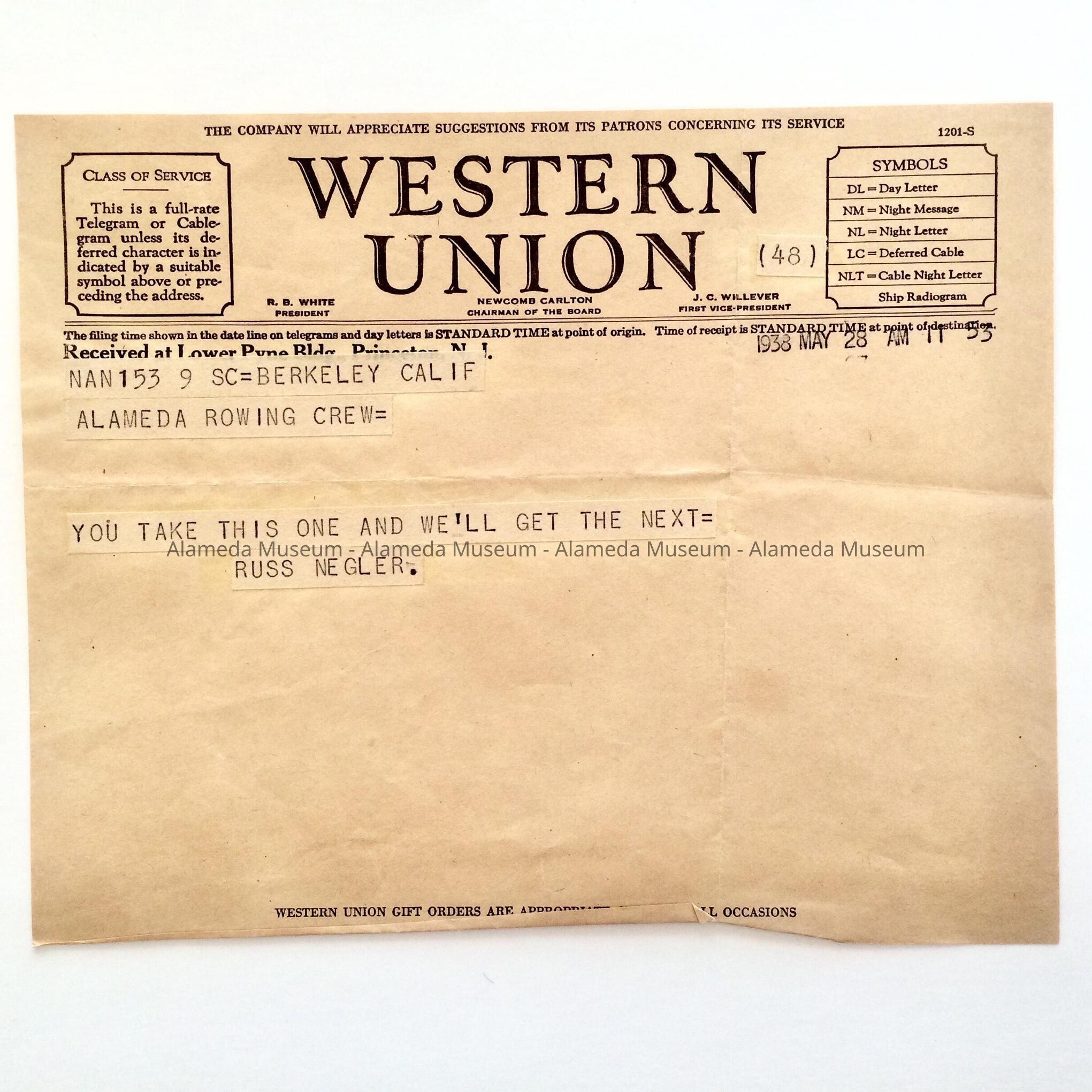 A WESTERN UNION TELEGRAM WHOSE CONTENTS EXPRESSED TEAM SUCCESS AT THE RACE IN PRINCETON, NJ.