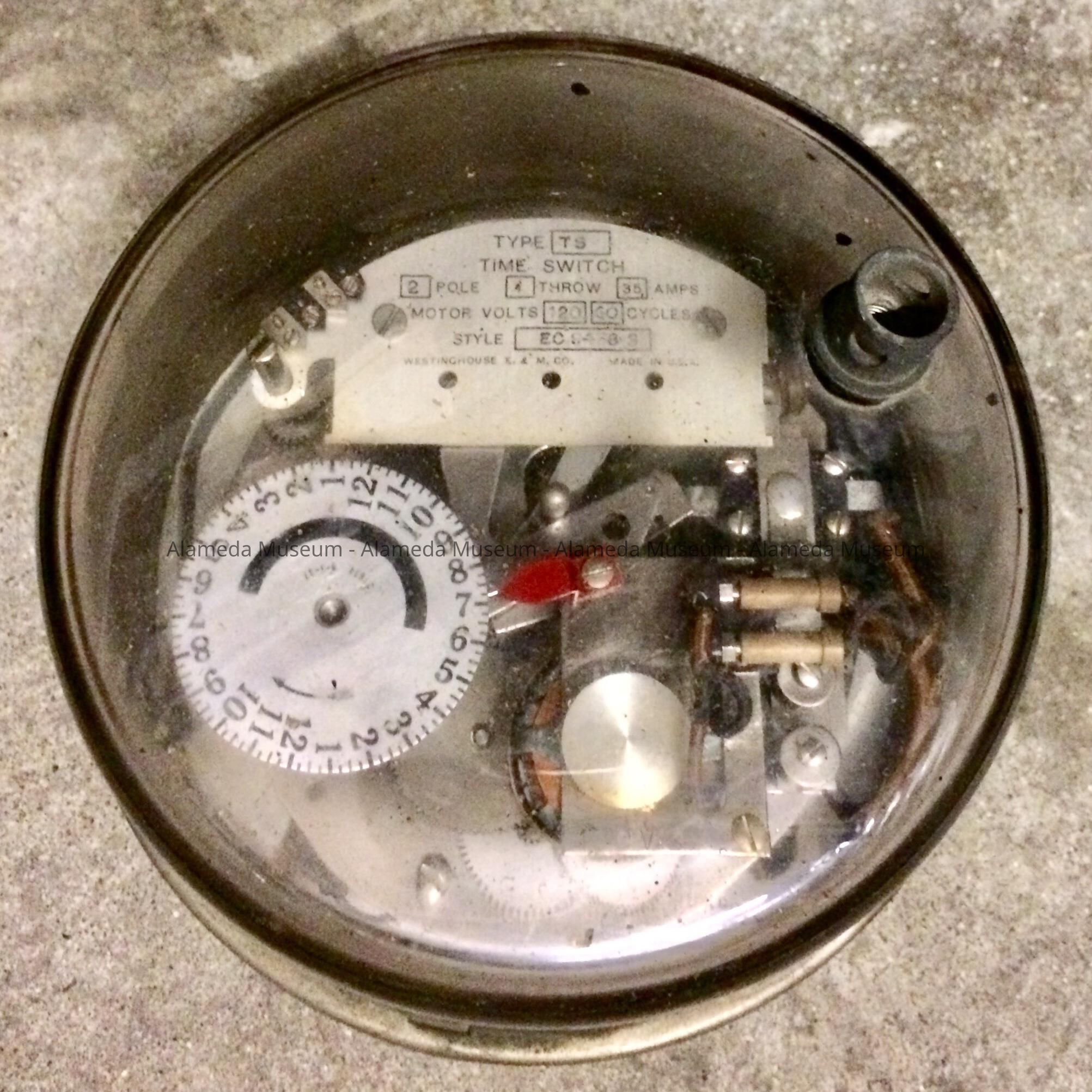 Meter, circular shaped, with glass dial cover. Westinghouse Time Switch. 2 pole single throw. 120 V. 60 HZ 36 AMP. Manufactured by Westinghouse Electric & MFG. Co.