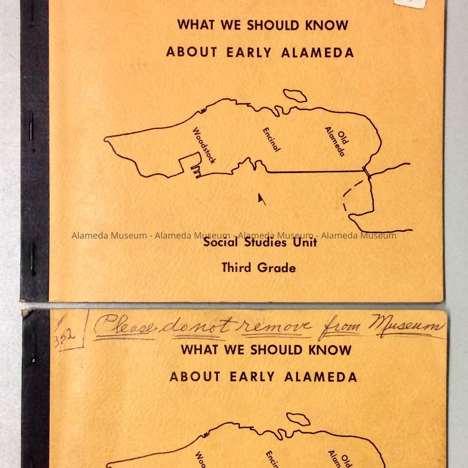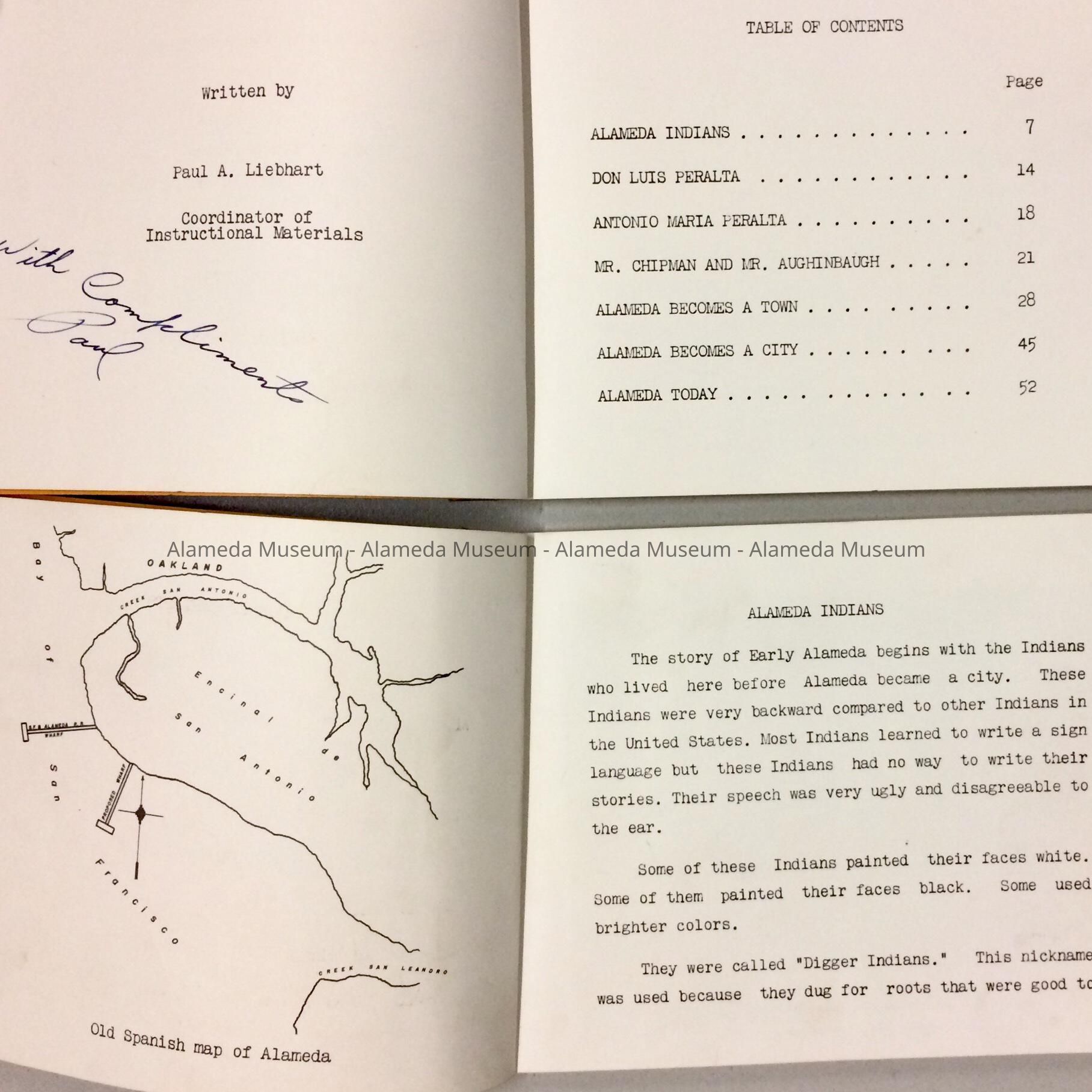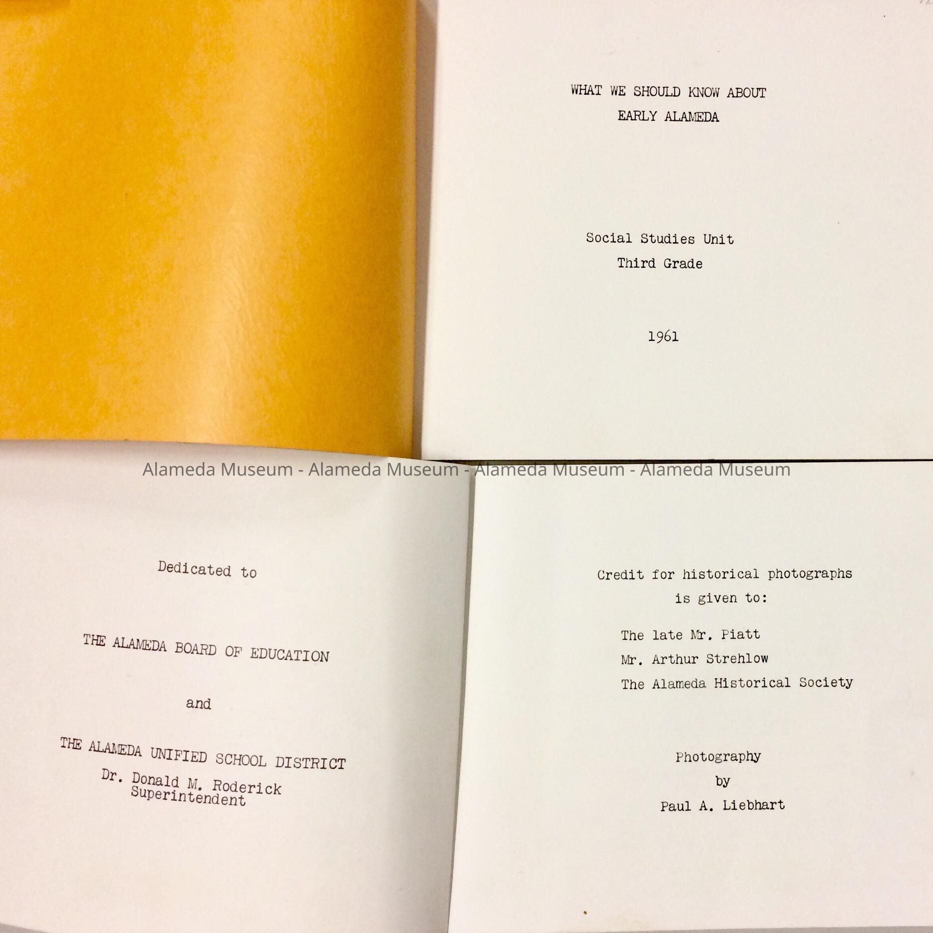 History: Textbook titled, "What We Should Know About Early Alameda." Part of the Social Studies unit of the Third Grade, Alameda Unified School District. It was written by Paul A. Liebhart, Coordinator of Instructional Materials. Copy A is autographed by Mr. Liebhart.