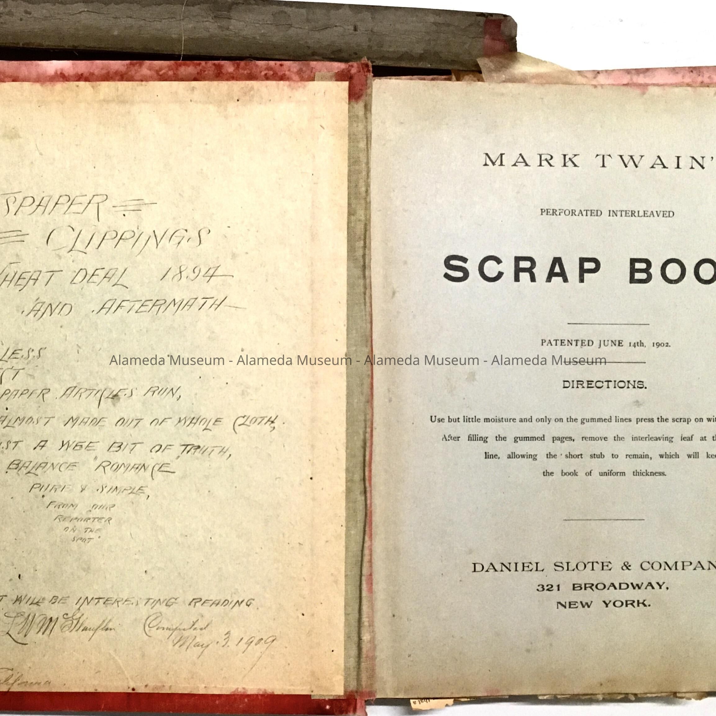 History of Object: Scrapbook compiled by Lewis W. McGlauflin of newspaper clippings concerning his wholesale wheat business. Mr. McGlauflin was a resident of 2250 San Antonio Avenue. He later became a real estate, insurance, & notary public, with a business located at 2407 Santa Clara Avenue.