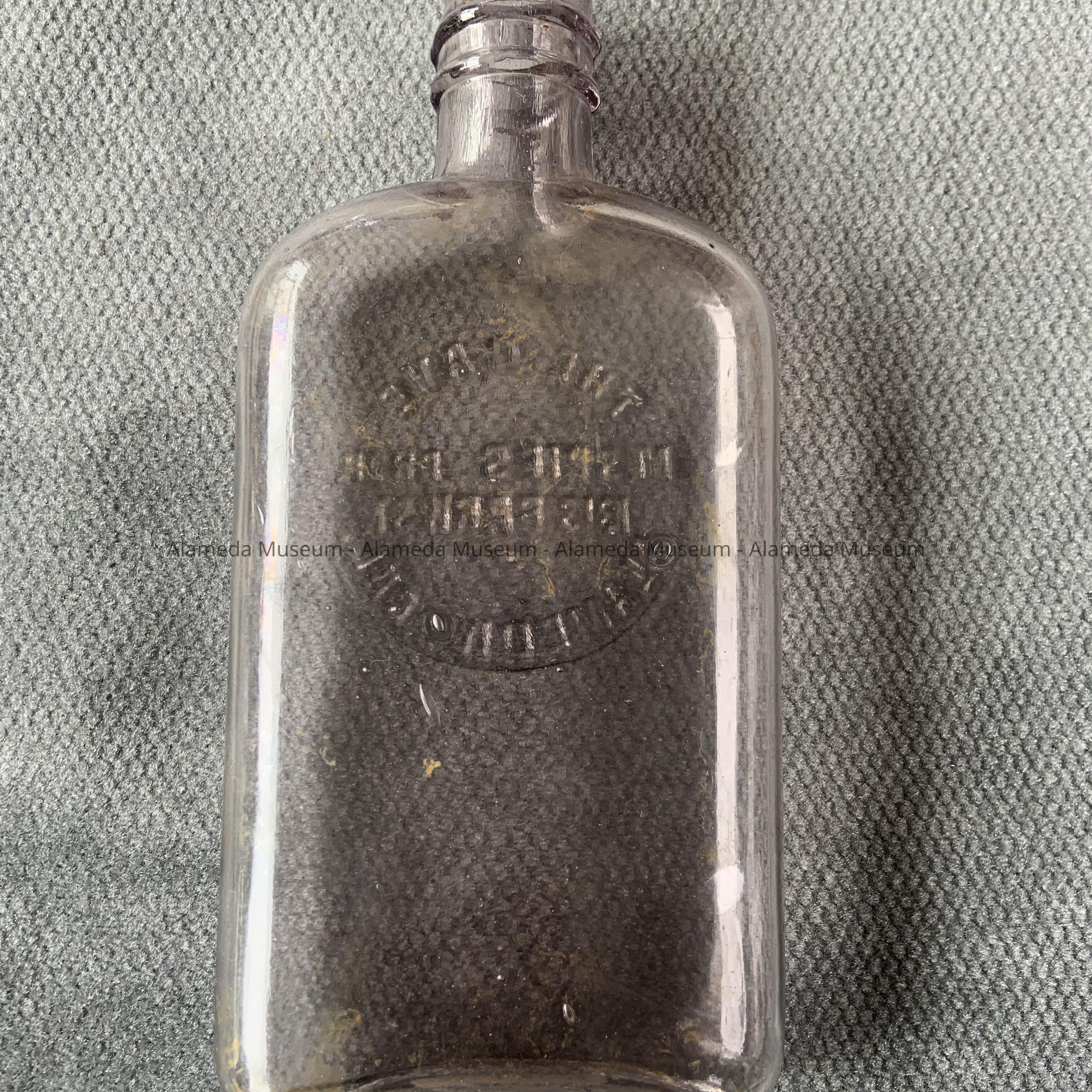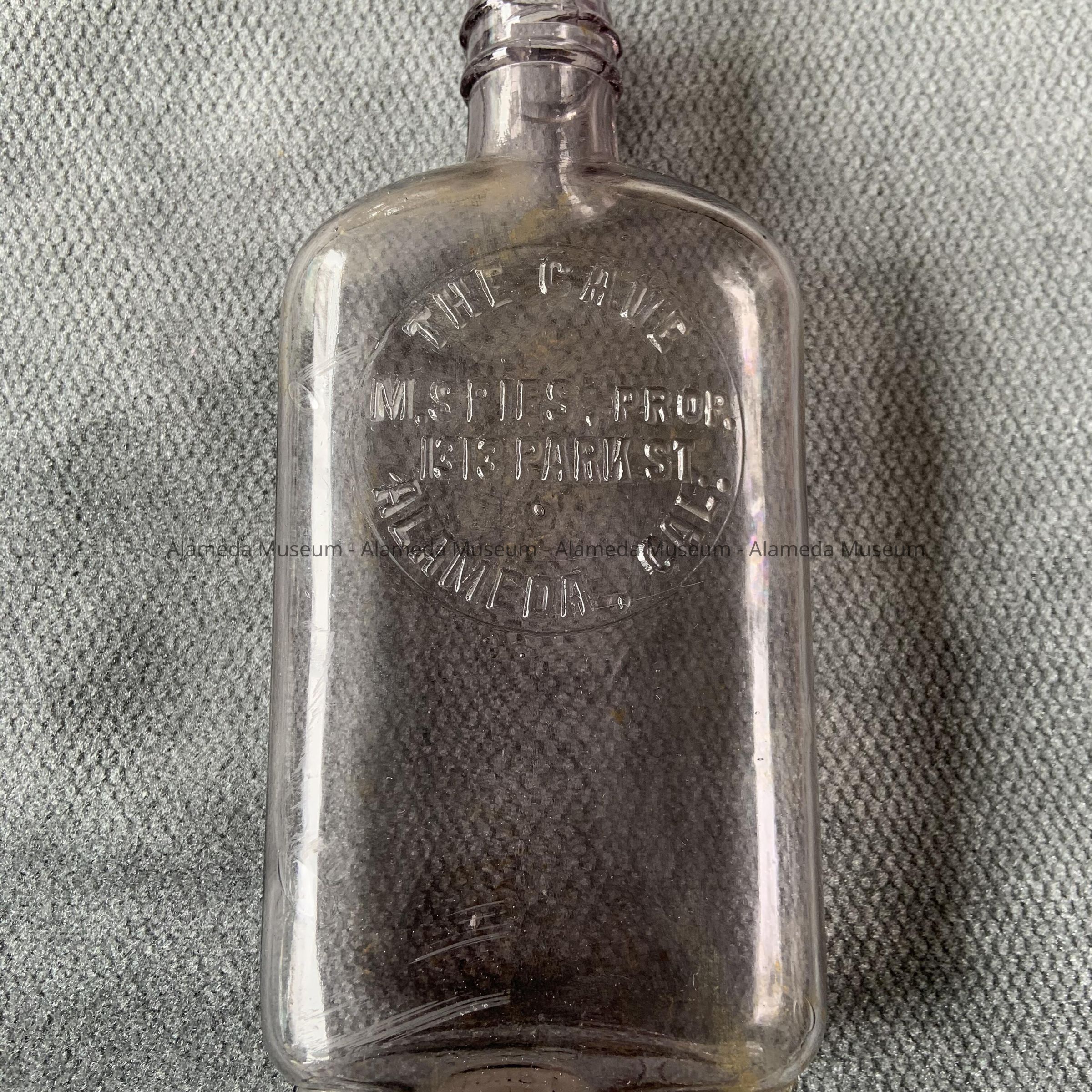 Description: Double seam clear glass flat sided whiskey bottle. The glass has turned to a lavender shade. The bottle has a circular-shaped medallion with the embossed caption: "The Cave, M. Spies, prop. 1313 Park St. Alameda, Cal."