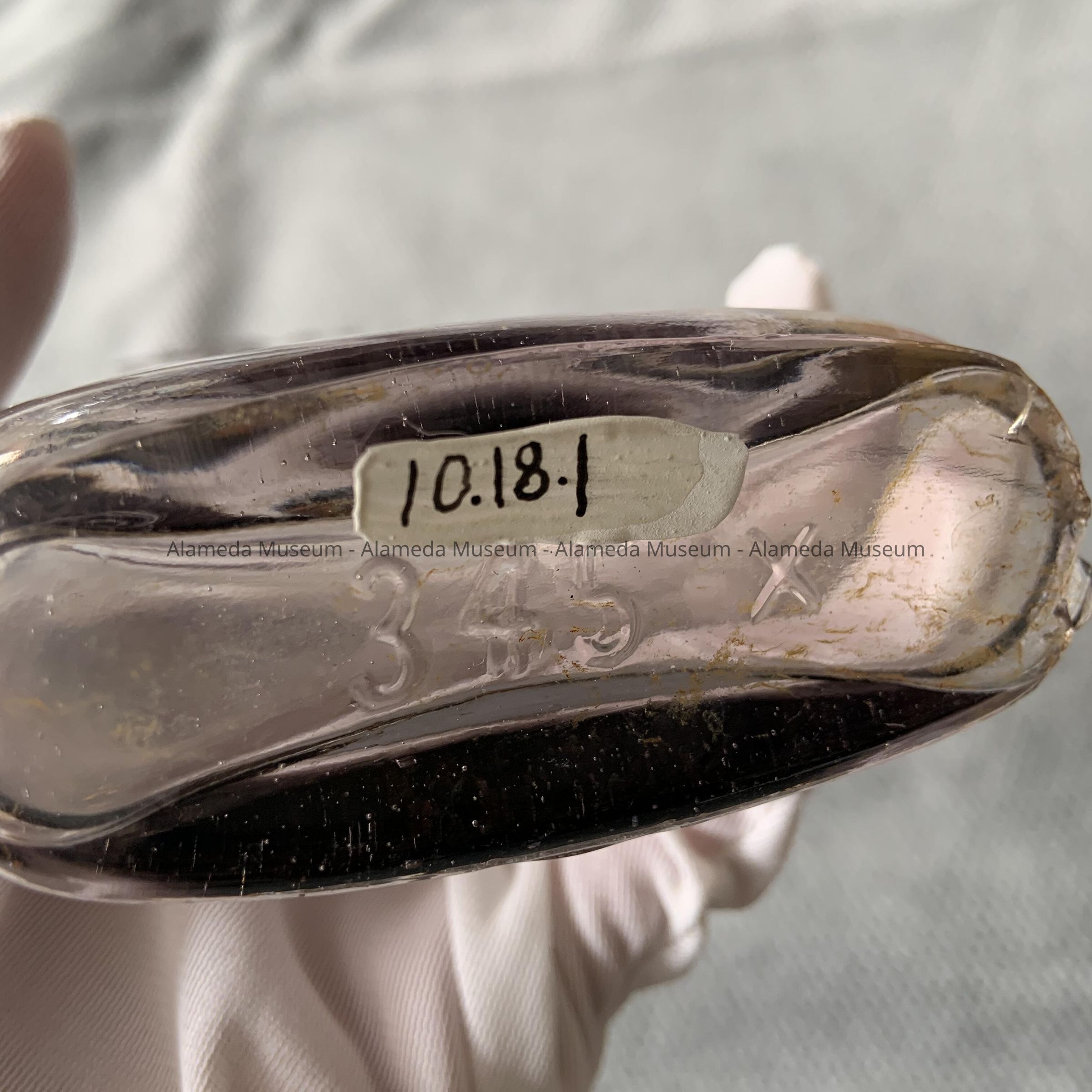 History of Object: Whiskey flask advertising “The Cave of 1313 Park Street.” This bottle was excavated from the grounds of an early home on San Antonio Avenue by the donor who is a plumber.