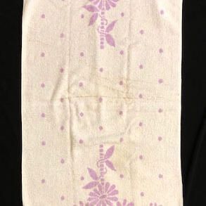BATH TOWEL OF WHITE- AND LAVENDER-COLORED TERRY CLOTH. THE TOWEL HAS A FLORAL DESIGN OF WHITE FLOWERS ON A LAVENDER BACKGROUND. BOTH ENDS OF TOWEL HAVE HAND CROCHETED FRINGES. TOWEL IS SIGNED, "CANNON," ON ATTACHED EMBROIDERED SILK LABEL.
