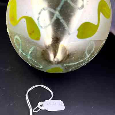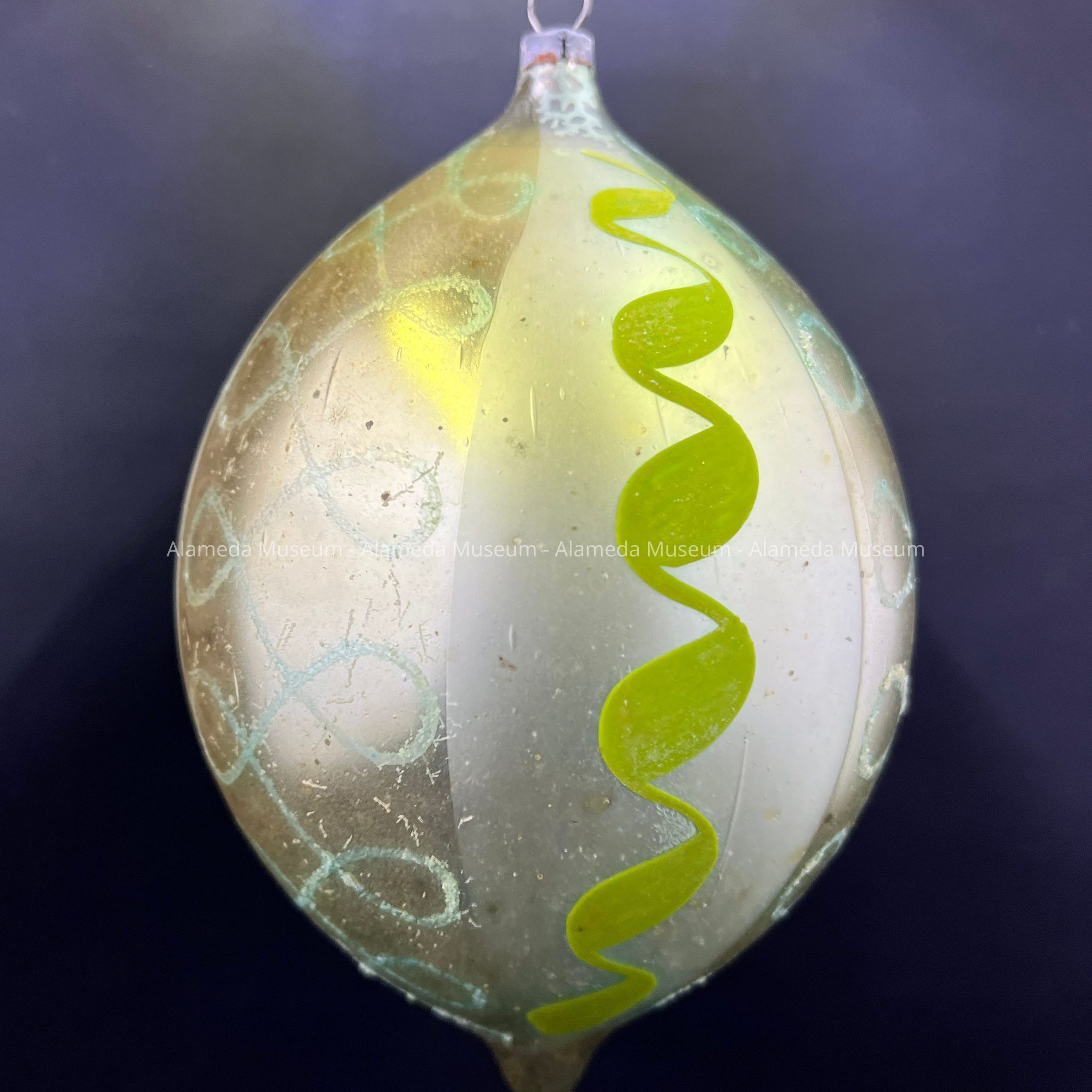 Description: A glass ornament shaped like a ball with top and bottom elongated to a point; top has a metal cap and hoop for hanging. The ornament is divided into vertical sections, alternately painted matte silver decorated with blue loops, and shiny silvery-gold decorated with a green spiral swirl.