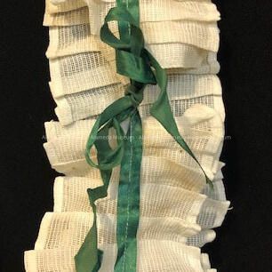 AN APRON OF WHITE SHEER COTTON, TRIMMED IN GREEN-COLORED SILK RIBBON.