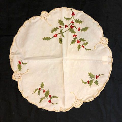 CIRCULAR-SHAPED TABLE DOILY OF WHITE LINEN, WITH SCALLOPED BORDER. SILK EMBROIDERY IN RED- AND GREEN-COLORED CHRISTMAS HOLLY. EDGE IS ACCENTUATED IN OFF-WHITE-COLORED EMBROIDERY.