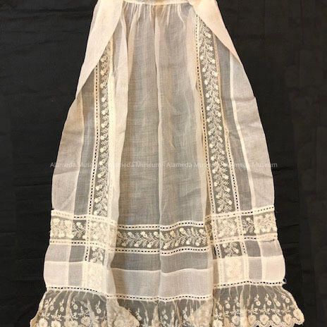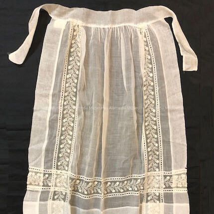 Tea apron worn by Mrs. William Henry Davis (nee Eleanor Jane Lott). Mr. & Mrs. Davis settled in Alameda in 1893.