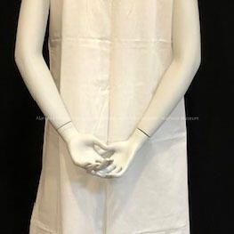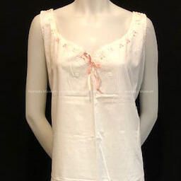 White cotton nightgown with scalloped embroidery around "sweetheart" neckline & arm openings. Embroidery eyelet openings for pink ribbon. Flower motif embroidery at bodice. Ballerina length. Button openings at each shoulder.