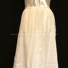 Description: Fine white cotton petticoat with over flounce hem in machine lace & embroidery. Tie-string closure.