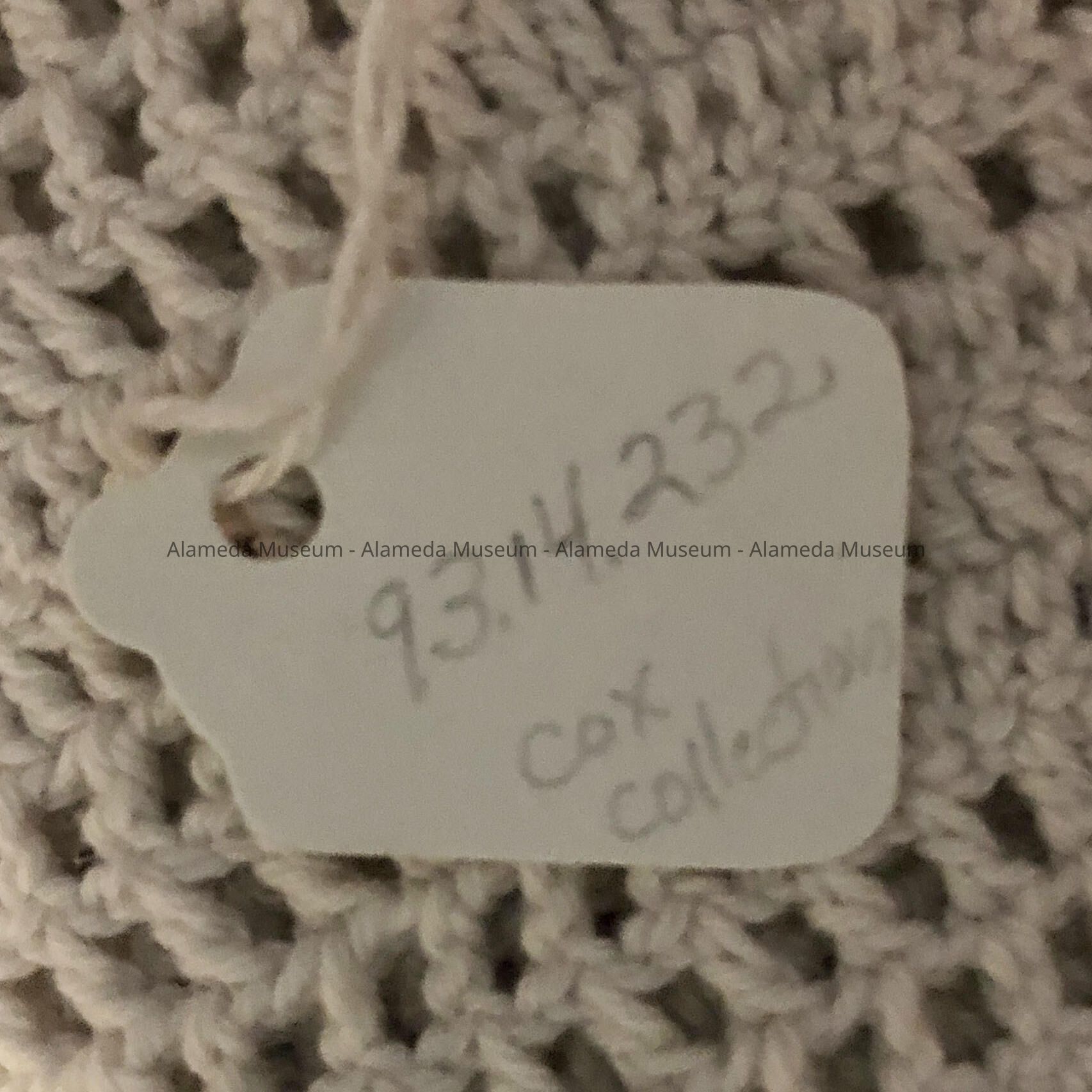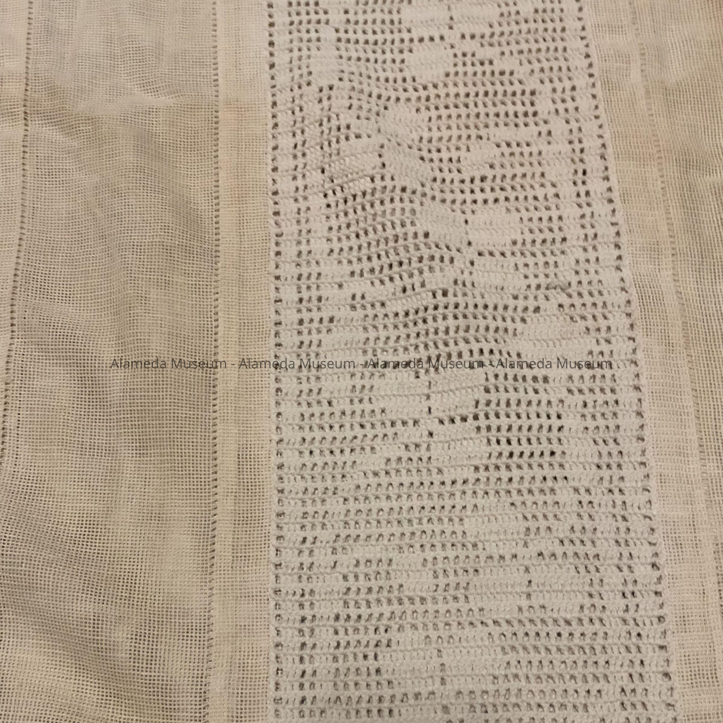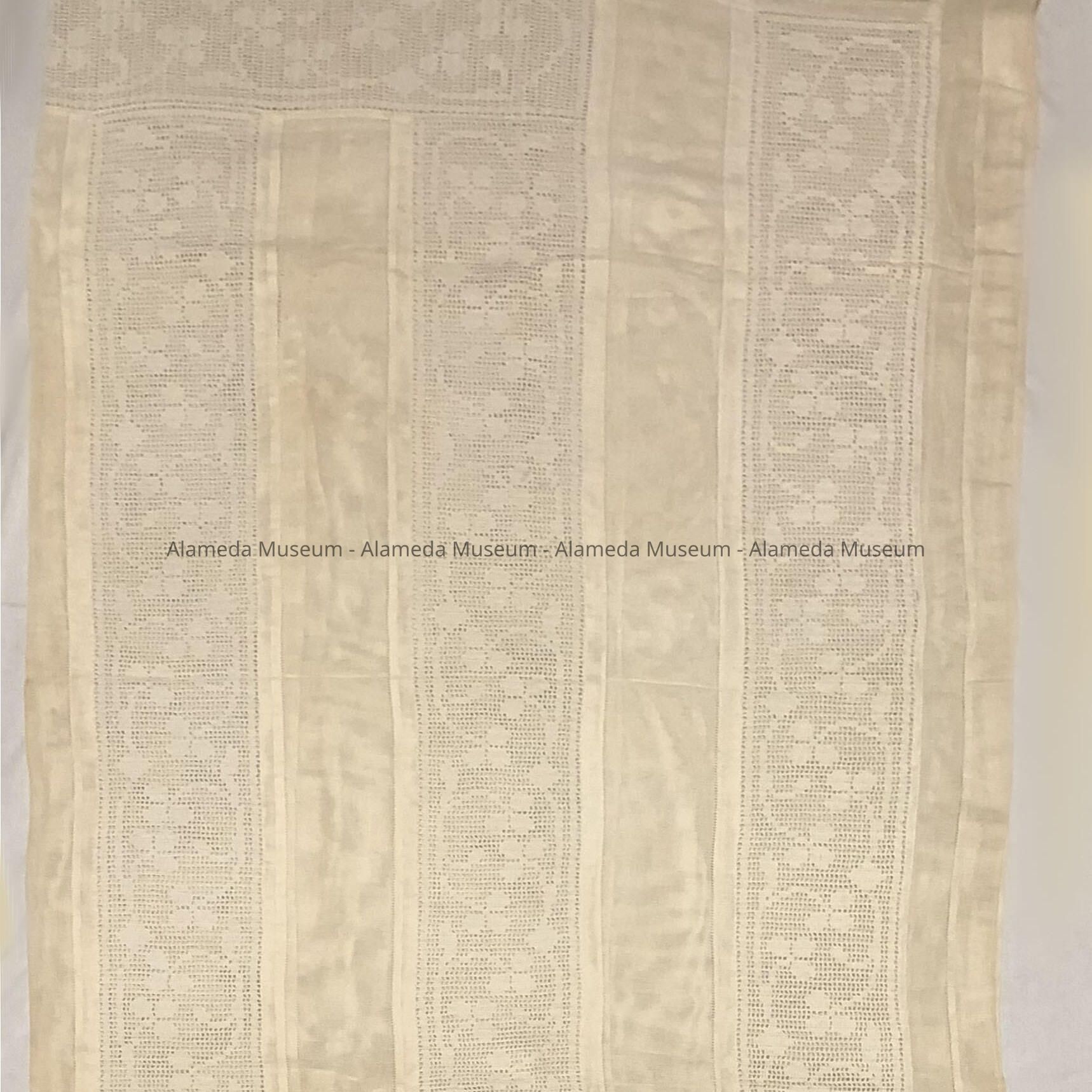 Bedspread belonged to Mr. & Mrs. William Cox of Santa Clara Ave. The attached card accompanying the bedspread states crochet work done by a member of the Toye family, the hemstitch and assembly done by Adeline T. Cox in 1925 while at 2621 Santa Clara Ave., also, that it was washed July 1990.