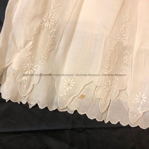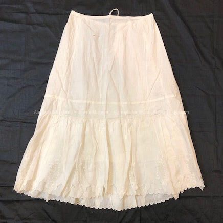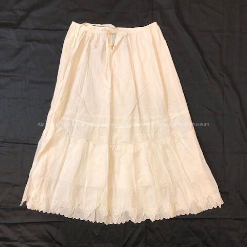 Half petticoat, white, upper portion cotton with flounce of embroidered eyelet on lawn fabric. Scalloped hem emphasized with embroidery.