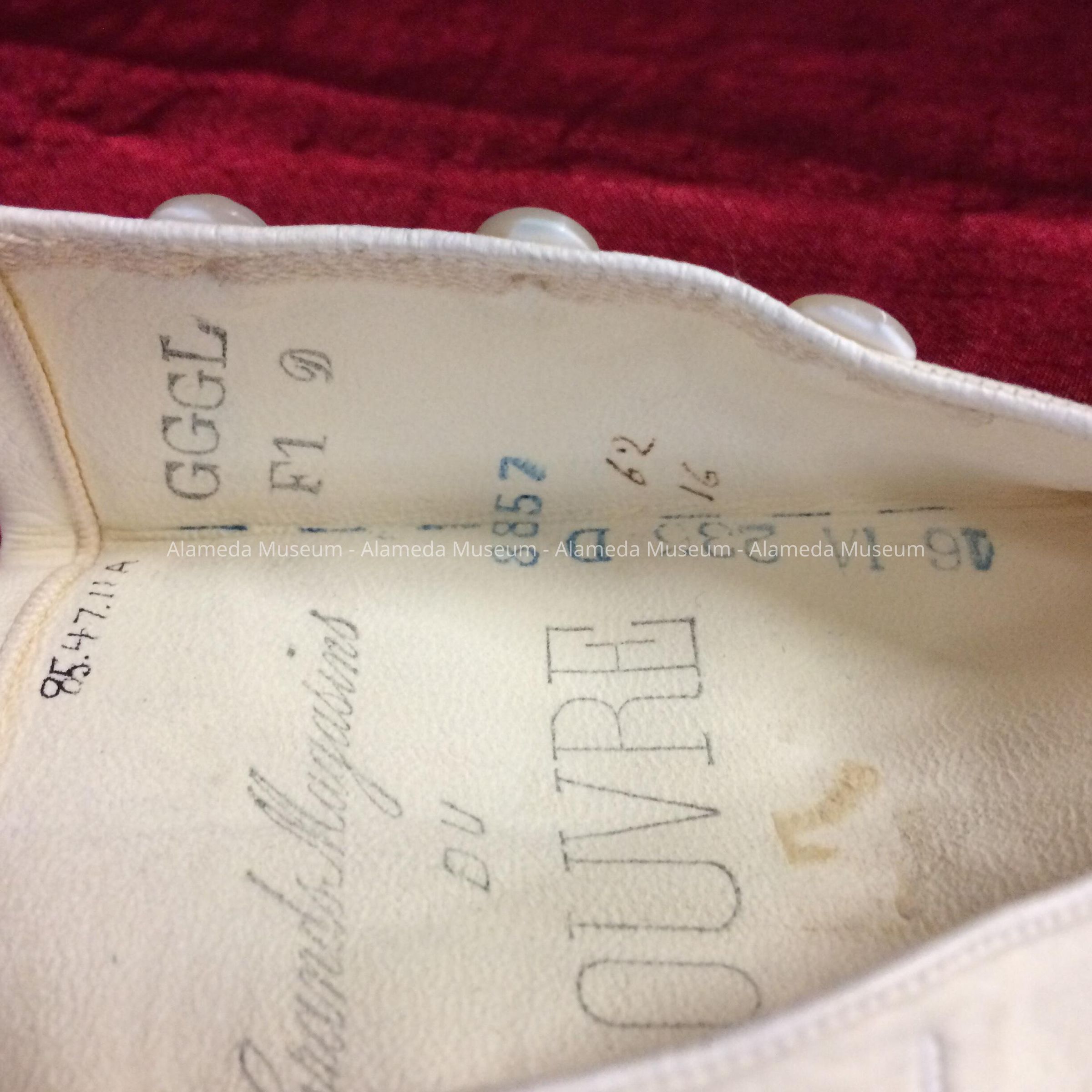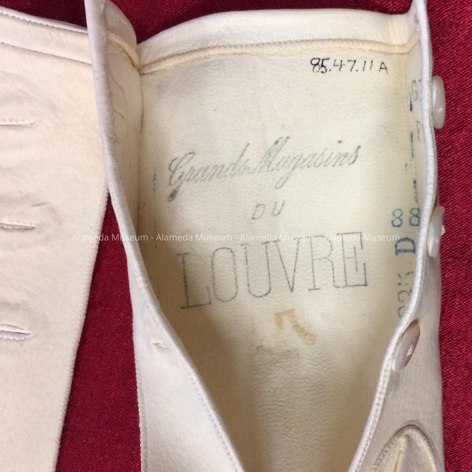 Description: White colored kid gloves (size 6) with each having 3 mother-of-pearl buttons at the wrist. Interior of the left glove stamped "Grands Magasins Du Louvre."