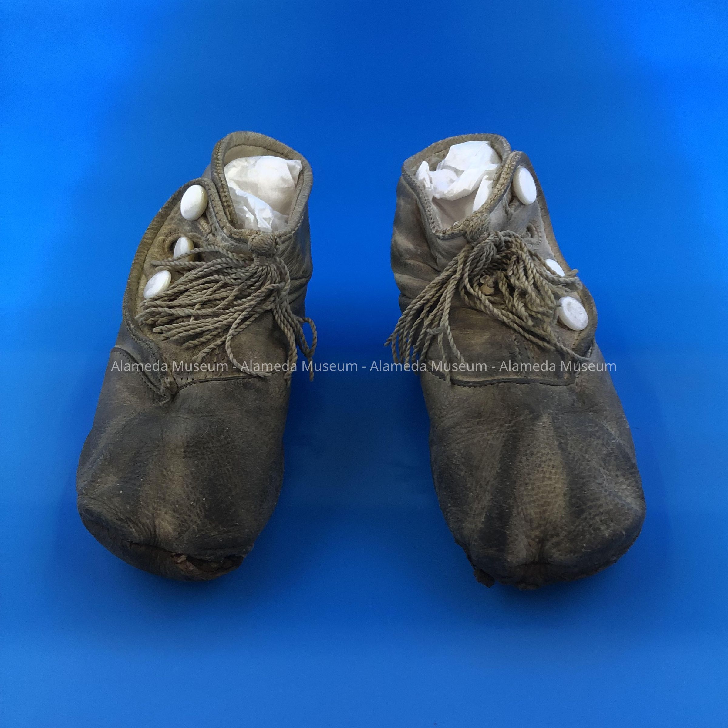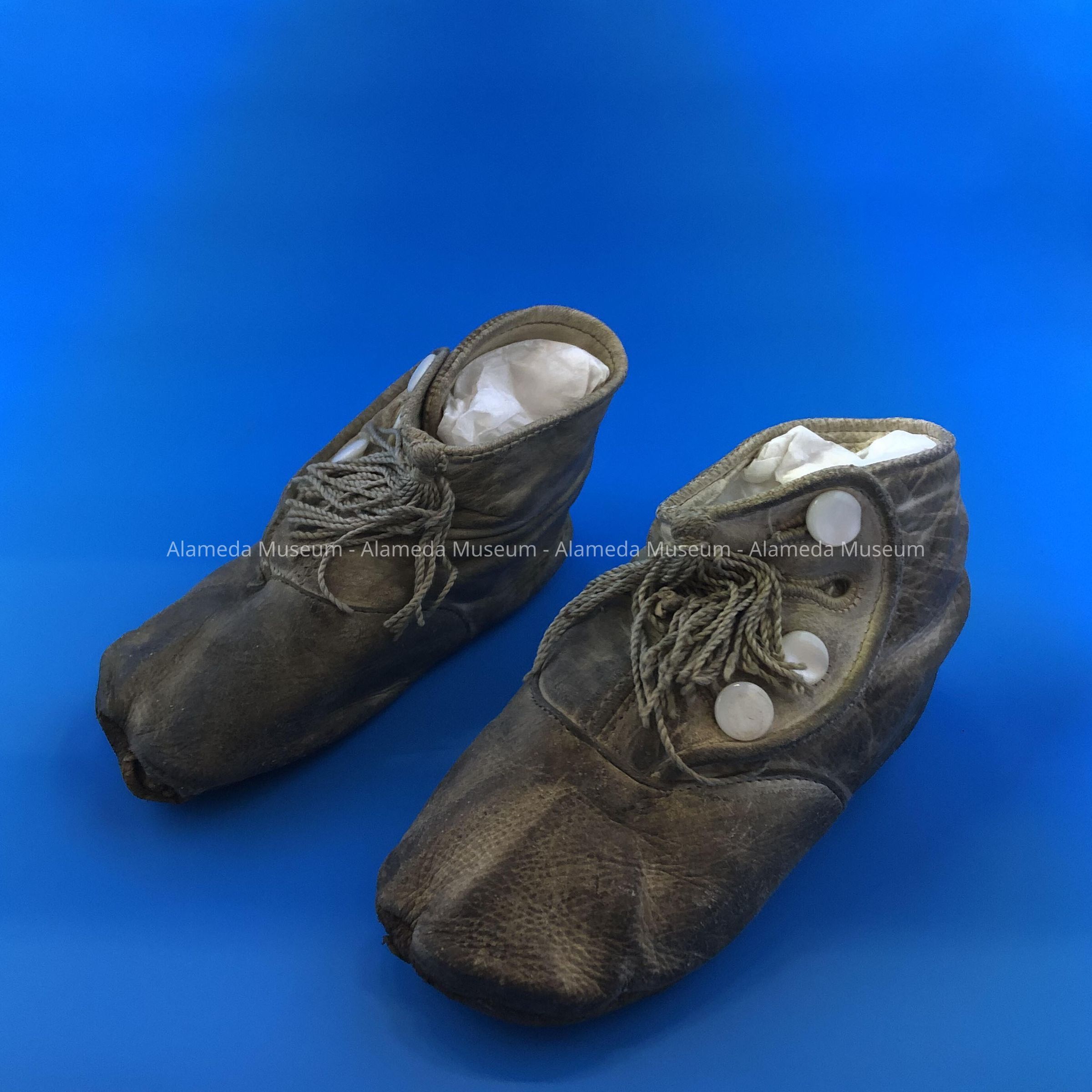 Baby shoes worn by either Wm. F., Paul, or David, sons of Mr. & Mrs. Cox. All believed to have been born in the 1920's. Accompanying history in Adeline T. Cox's hand writing in her late 80's or 90's.
