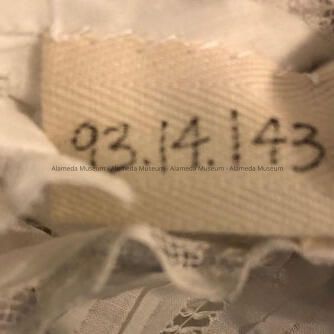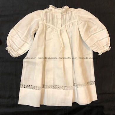 Baby dress worn by Adeline Toye Cox around age one or two years of age. Daughter of an Alameda pioneer family.