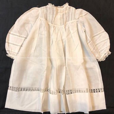 Baby dress of white lawn, high waisted with bodice of drawn work, machine lace trim at neck and sleeves. Row of inset panels accentuated at lower portion of puffed sleeves. Lower section of skirt has horizontal panel of drawn work.