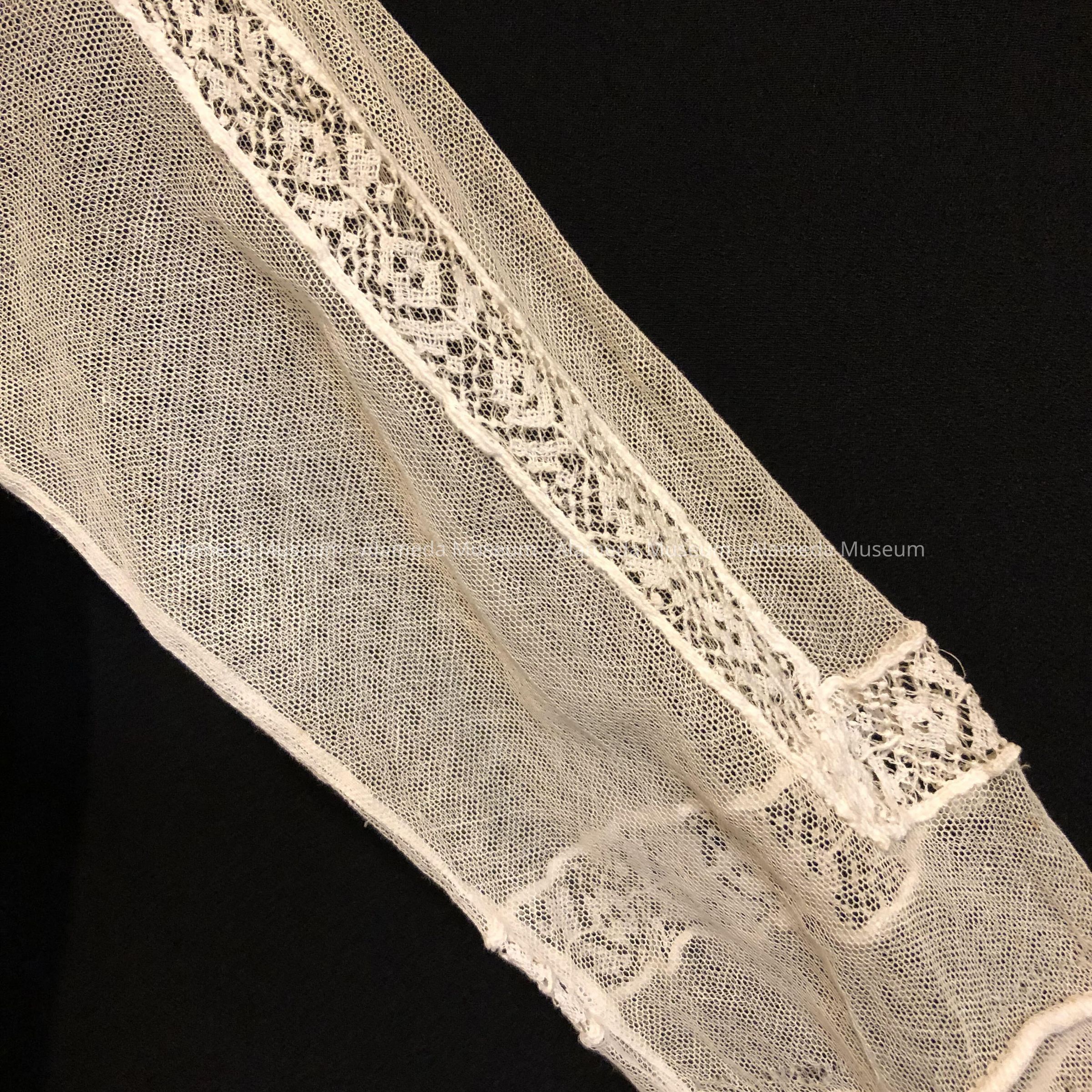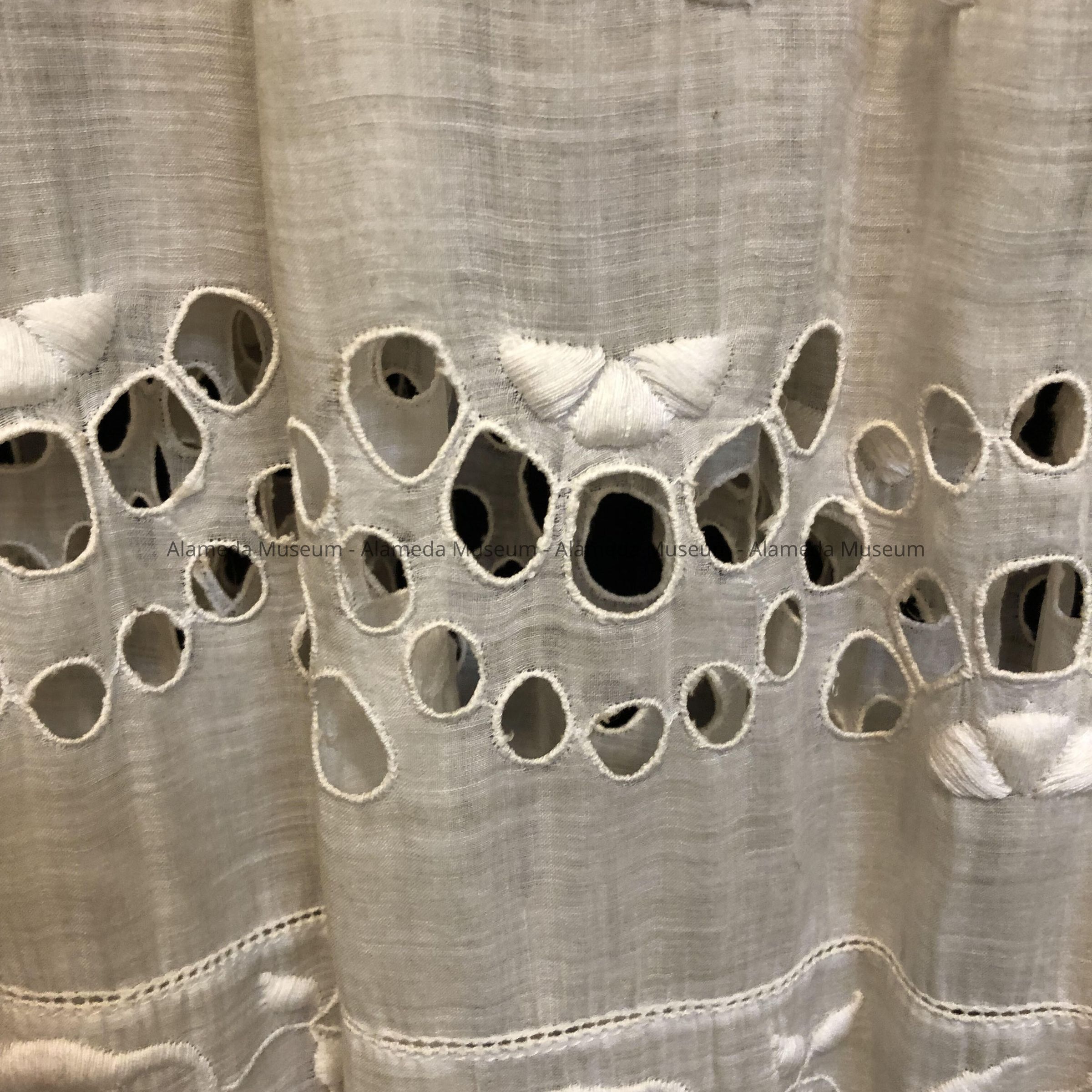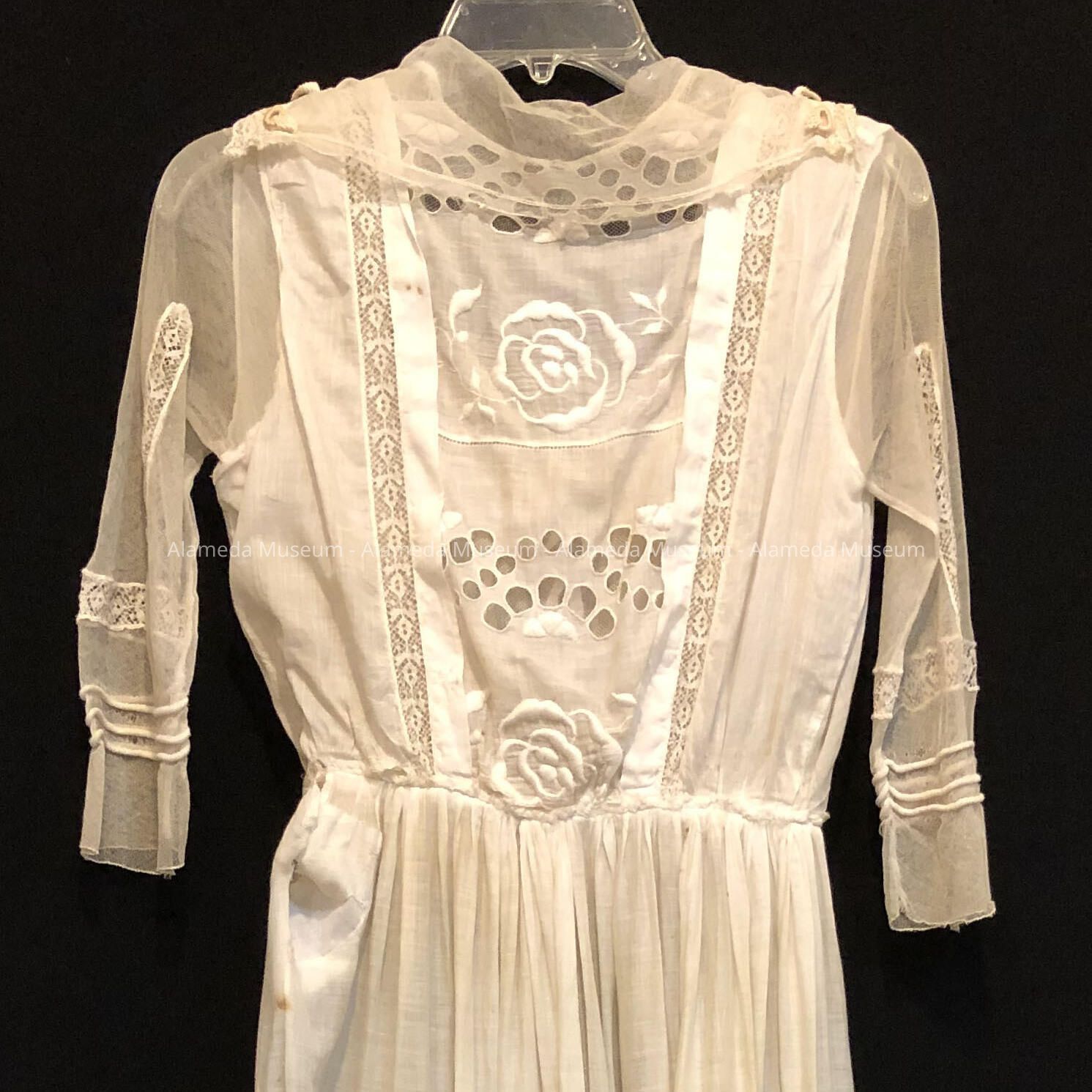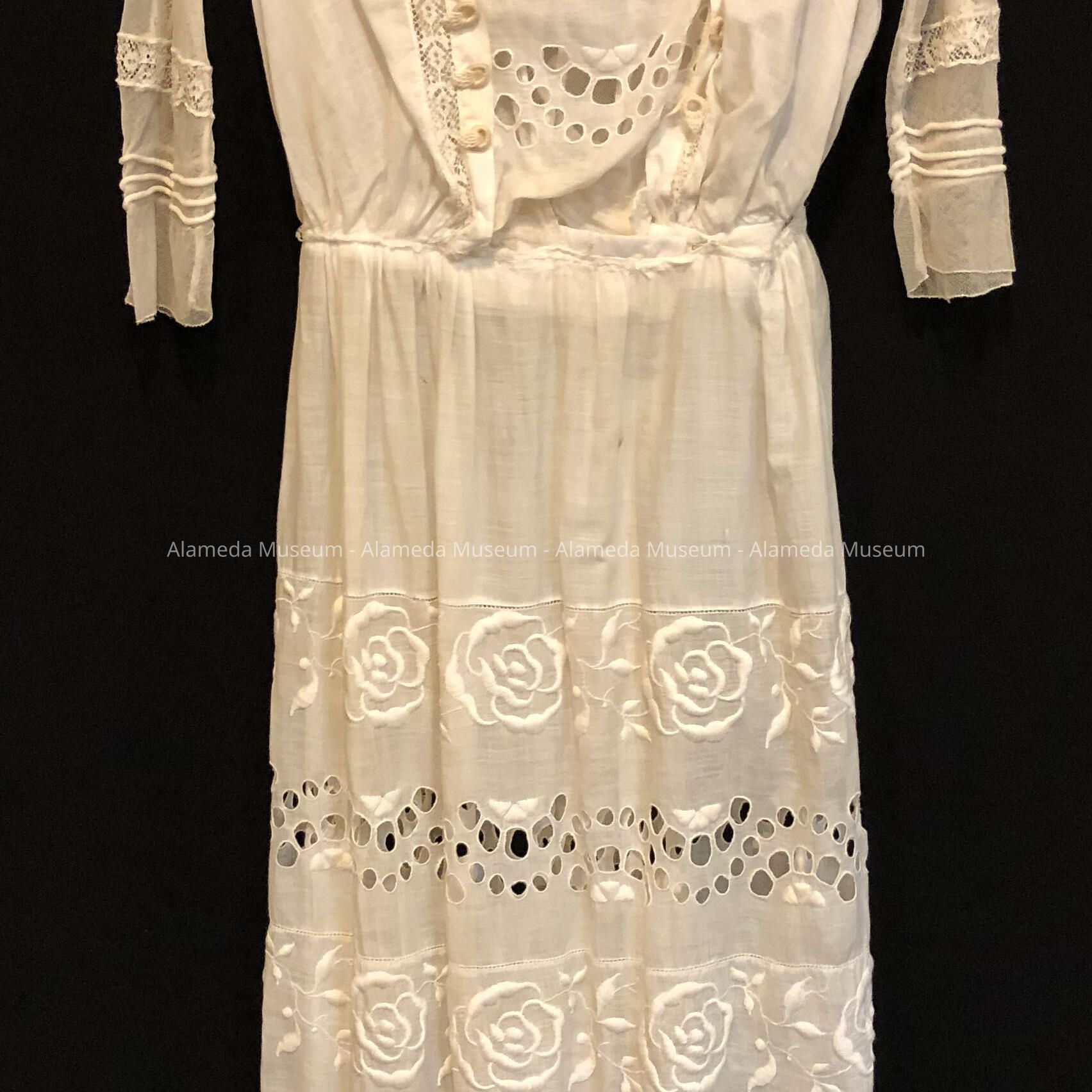 Description: White lawn dress with square neckline and 3/4 length sleeves of tulle and lace insets. Bodice and skirt has large rose embroidery and cut work. Square collar of tulle with lace trim.