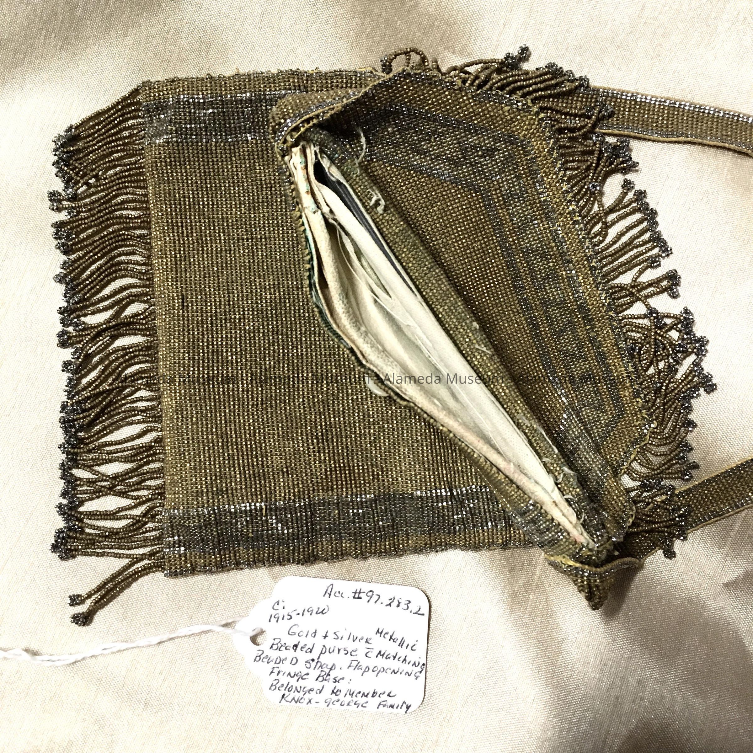 White, leather lined, gold and Silver metallic beaded purse with fringe, 1915-1920Entry/Object ID